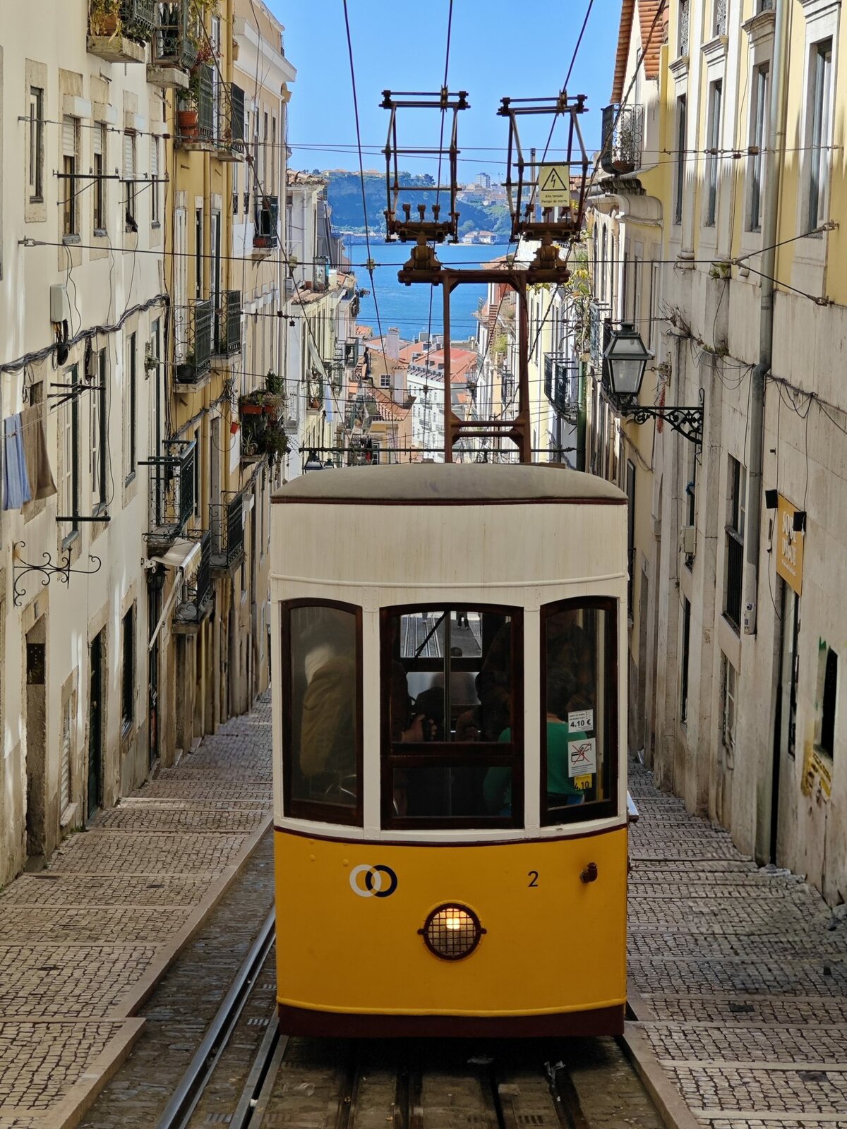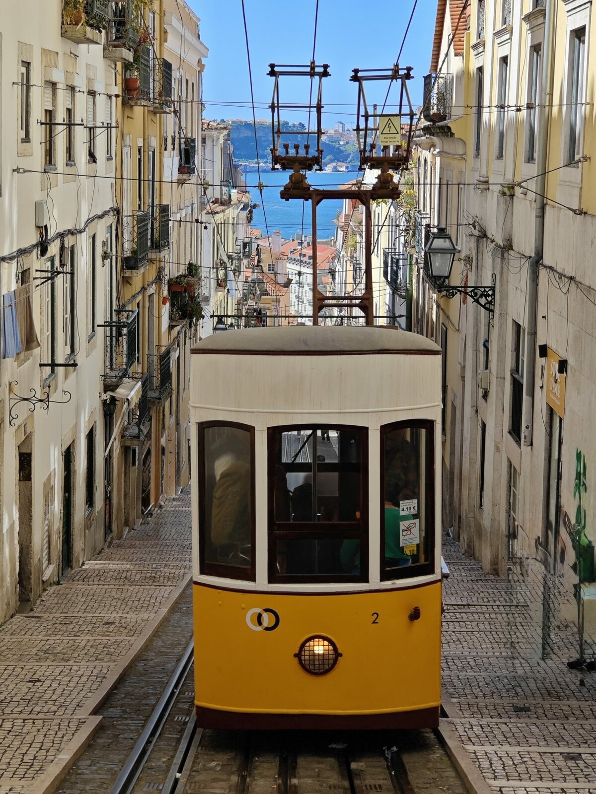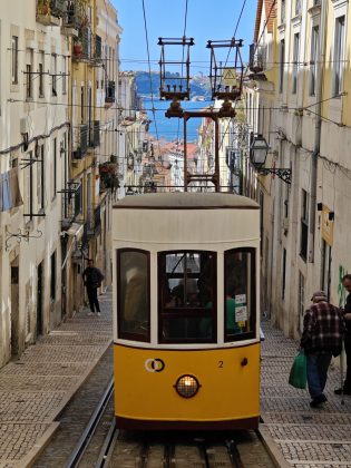 Это классический кадр — популярные лиссабонские трамваи на фоне набережной вдалеке. Избавиться от людей на улице будет достаточно просто.