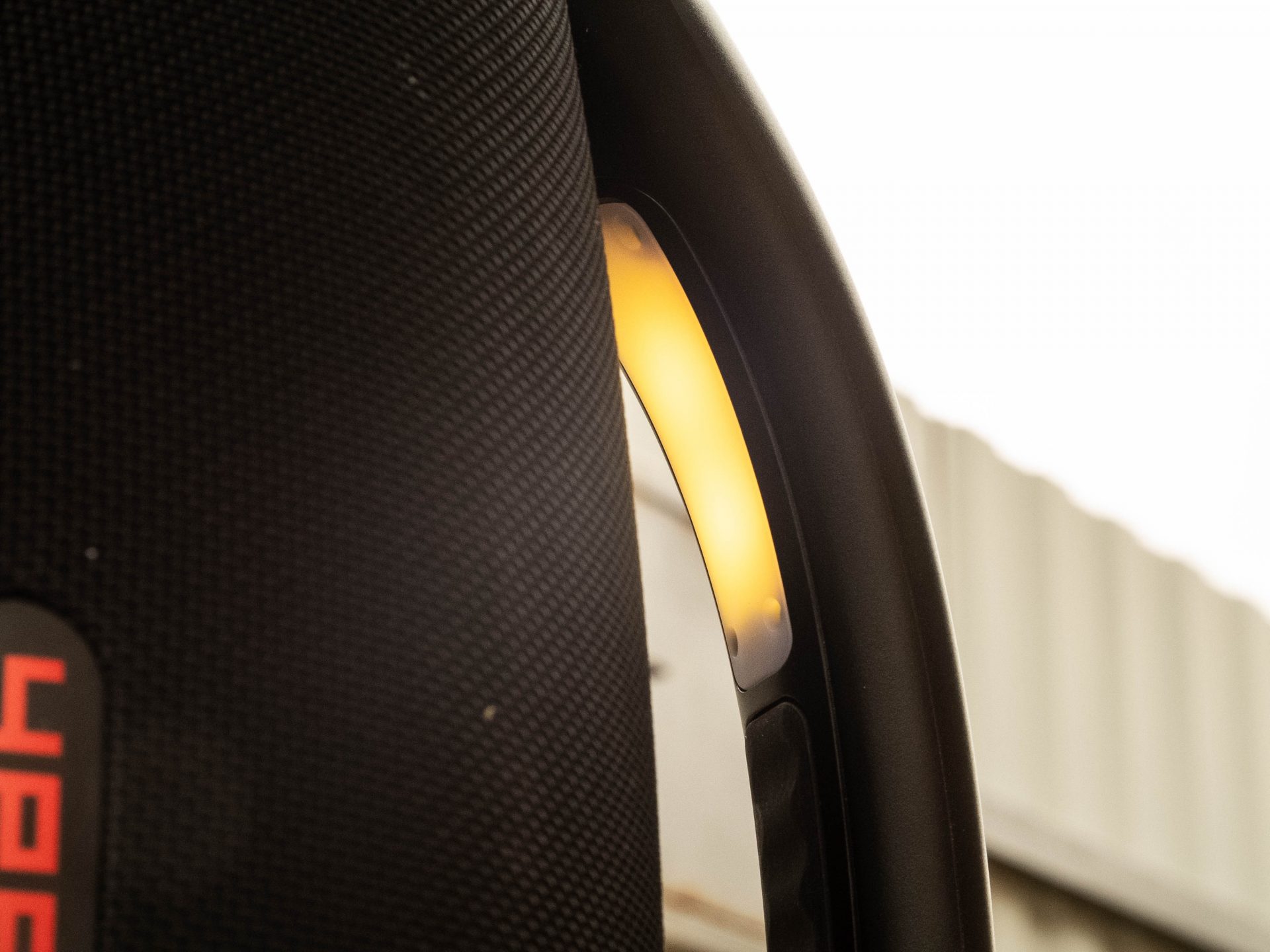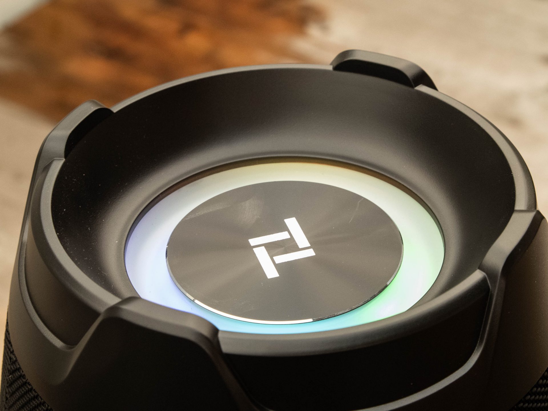 За создание атмосферы отвечает мощная адаптивная подсветка, расположенная вокруг пассивных излучателей и в рукоятке. Смена режимов (мы насчитали восемь) происходит автоматически, ритмические рисунки разные. Также колонка может подстраиваться под играющий трек. В темноте всё это выглядит очень эффектно.