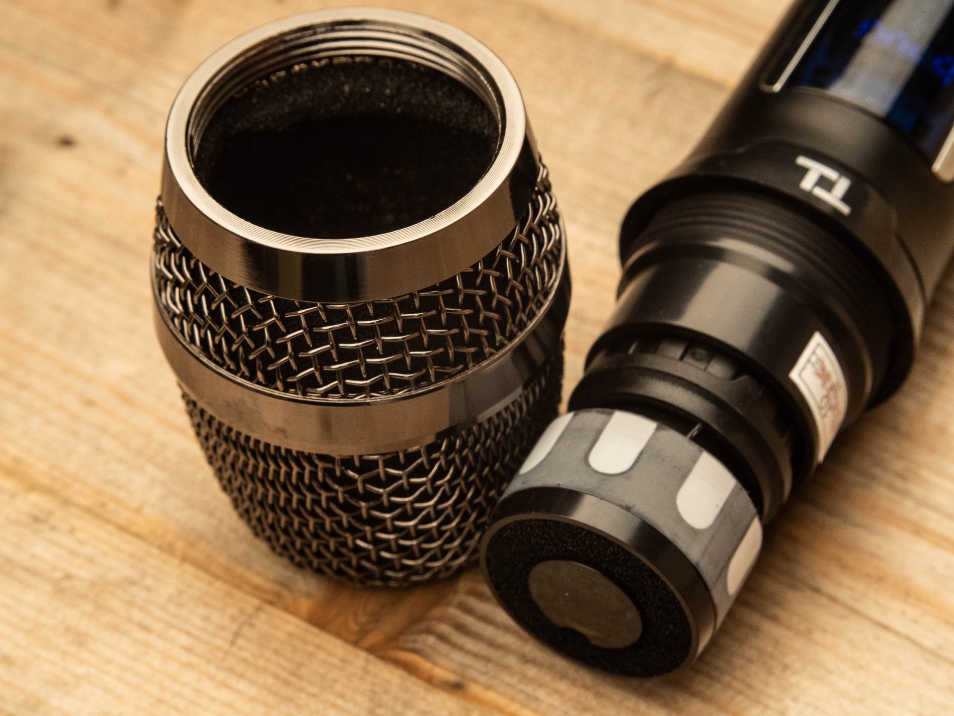 Что касается микрофона, то UHF-диапазон обеспечивает стабильность связи через 2 стены в городе. Головка выполнена из металлической сетки, под которой находится поролоновая шуба для защиты от ветра. Микрофон направленный, что намекает на профессиональный подход к вокалу. Дисплей на корпусе показывает уровень заряда и сигнала, а также позволяет настраивать уровень громкости, частоту и другие параметры. Конструкция хорошо продумана: микрофон удобно лежит в руке и не выскальзывает.
