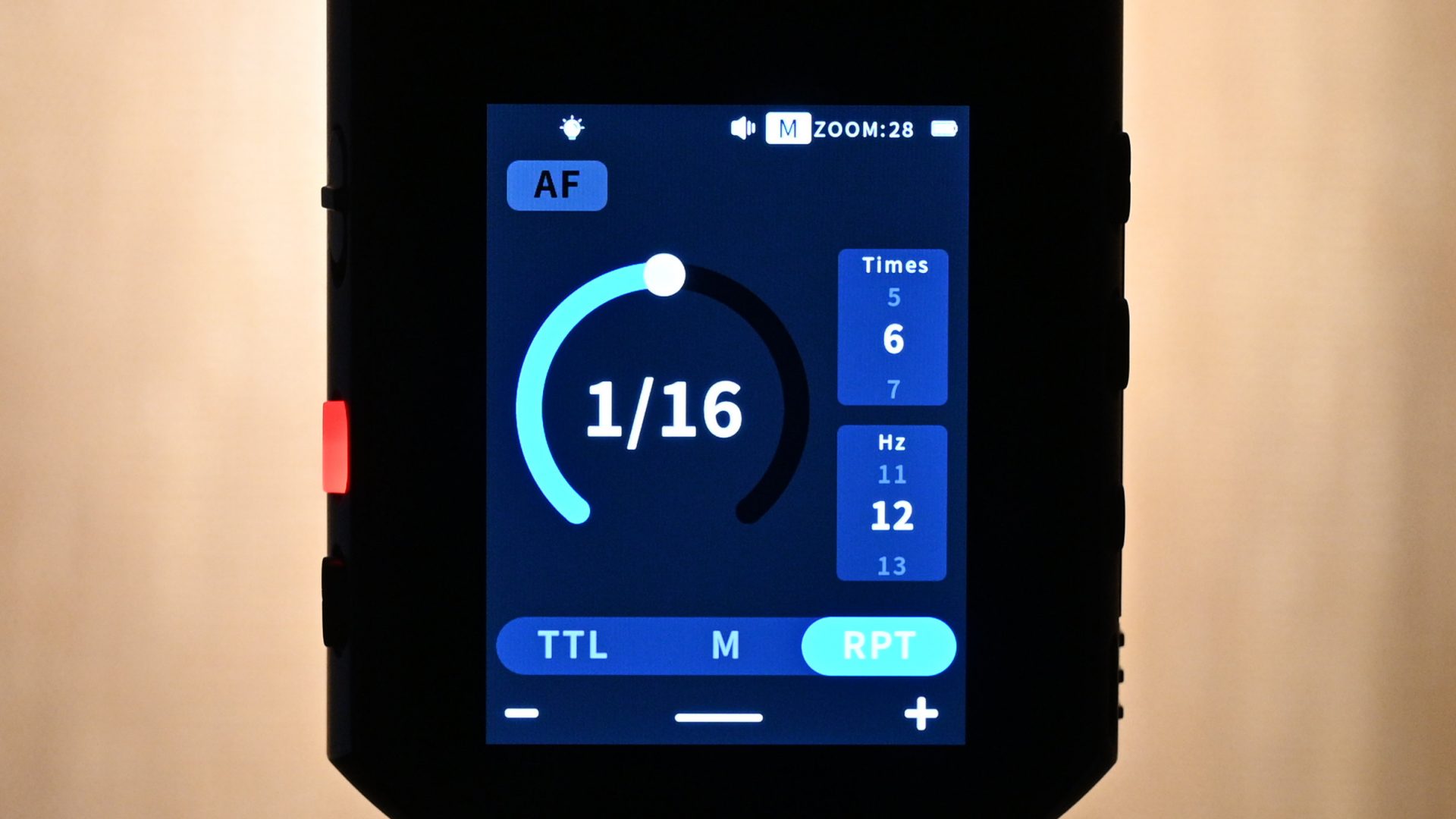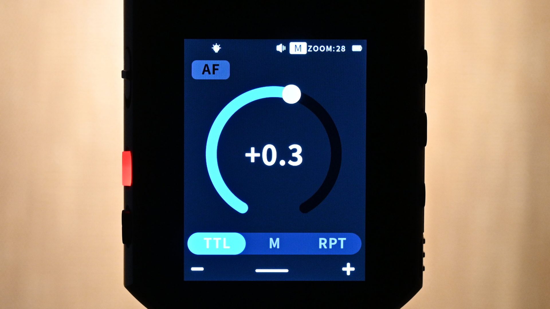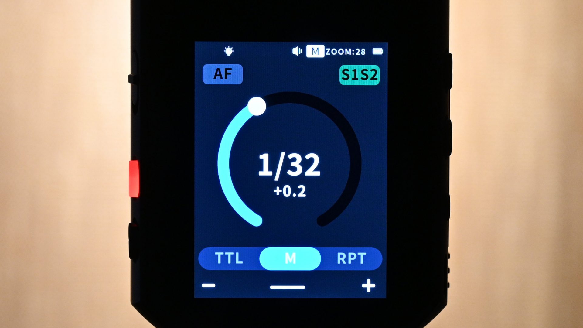 Я выбрал четыре основных экрана из интерфейса для галереи ниже. На них показано, как выглядит подсвеченный сенсорный экран в автоматическом режиме замера экспозиции вспышки TTL (Through The Lens), основное меню, которое открывается при свайпе вверх, а также режимы ручного режима вспышки и программируемого повтора/стробоскопического режима. Мне нравится интуитивно понятное удобство, но посмотрите сами и скажите, что думаете.