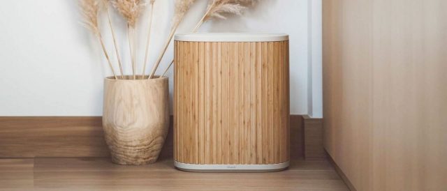 Я выбрал бамбуковую версию за $469 (~39 тыс. руб.), которая идеально вписалась в мой офис, особенно рядом с мусорной корзиной из ротанга. Несмотря на вес в 9,5 кг, у Windmill Air Purifier нет колесиков или ручки для перемещения.