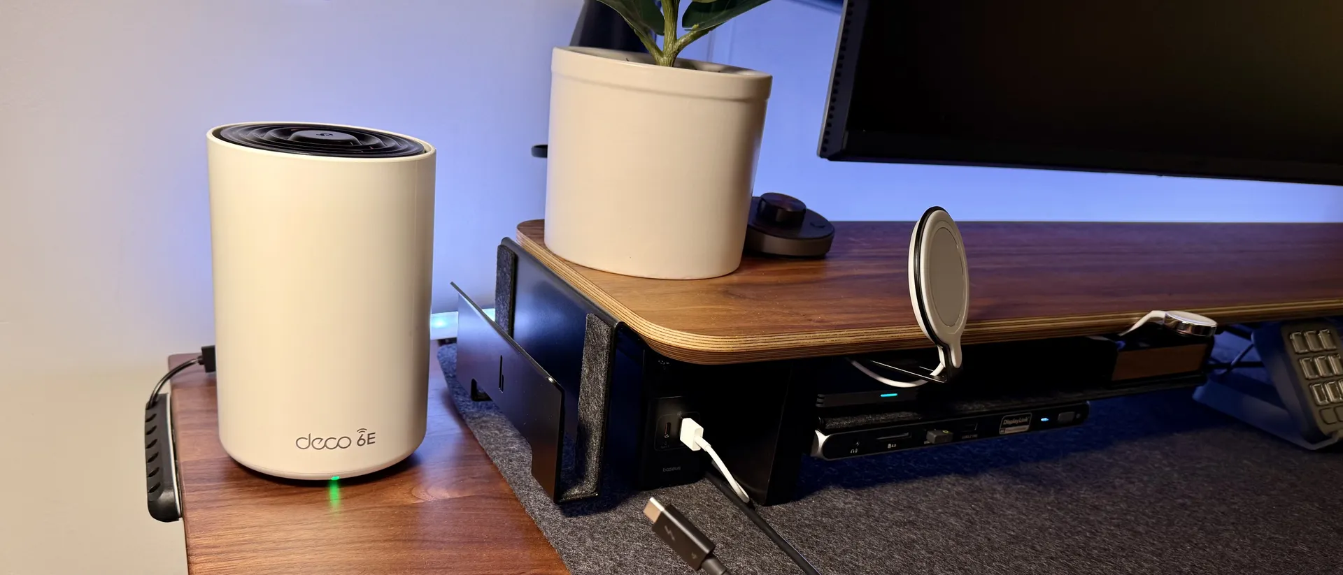 Когда я понял это, я пошёл дальше и купил небольшой сетевой коммутатор, который установил под своим столом (на фото ниже). Теперь у меня было несколько портов, к которым я мог подключаться и получать стабильное интернет-соединение даже без антенны Wi-Fi. Это было идеально для моей BeeStation, моего старого Mac Mini Server (который, как я был шокирован, до сих пор работает, даже без надёжной антенны Wi-Fi) и некоторых точек доступа умного дома (Phillips Hue, Flic и т. д.). Далее я хотел сделать своё соединение максимально качественным. В то время мой центральный блок находился за рождественской ёлкой, и у меня начались проблемы. Поэтому я поискал информацию и выяснил, что рождественские ёлки могут создавать помехи. Итак, я перенёс свой основной маршрутизатор в другую часть гостиной, и вуаля, у меня появилось почти идеальное соединение с двумя другими точками доступа, работающими на полных каналах Wi-Fi 6 ГГц, 5 ГГц и 2,4 ГГц и подключающимися почти к 80 устройствам одновременно (да, в моём доме много умных технологий). В приложении Deco также есть встроенный оптимизатор, который помогает в этом. Одним щелчком мыши я могу изменить каналы, чтобы уменьшить помехи и ещё больше усилить свою сеть.