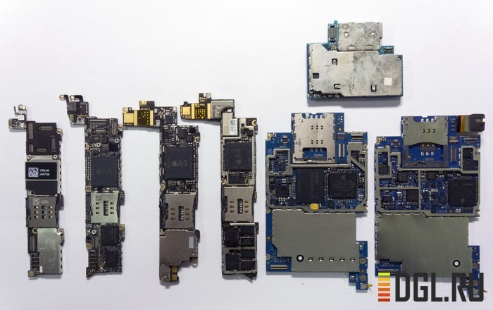 Слева направо: 5s, 5, 4s, 4, 3gs, 3g. Вверху плата самого первого iPhone
