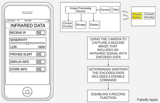 По информации, опубликованной на geektimes.ru, для предотвращения незаконной съемки Apple предложила использовать инфракрасные передатчики. Частотный диапазон цифровых камер шире, чем у человеческого глаза – камеры могут воспринимать инфракрасный сигнал. При получении специфического закодированного сигнала с устройства, размещенного в месте проведения концерта или показа спектакля, устройство не будет делать фотографии или видеозаписи. Важно, что для работы технологии не нужны дополнительные модули, понадобится только обновление прошивки.