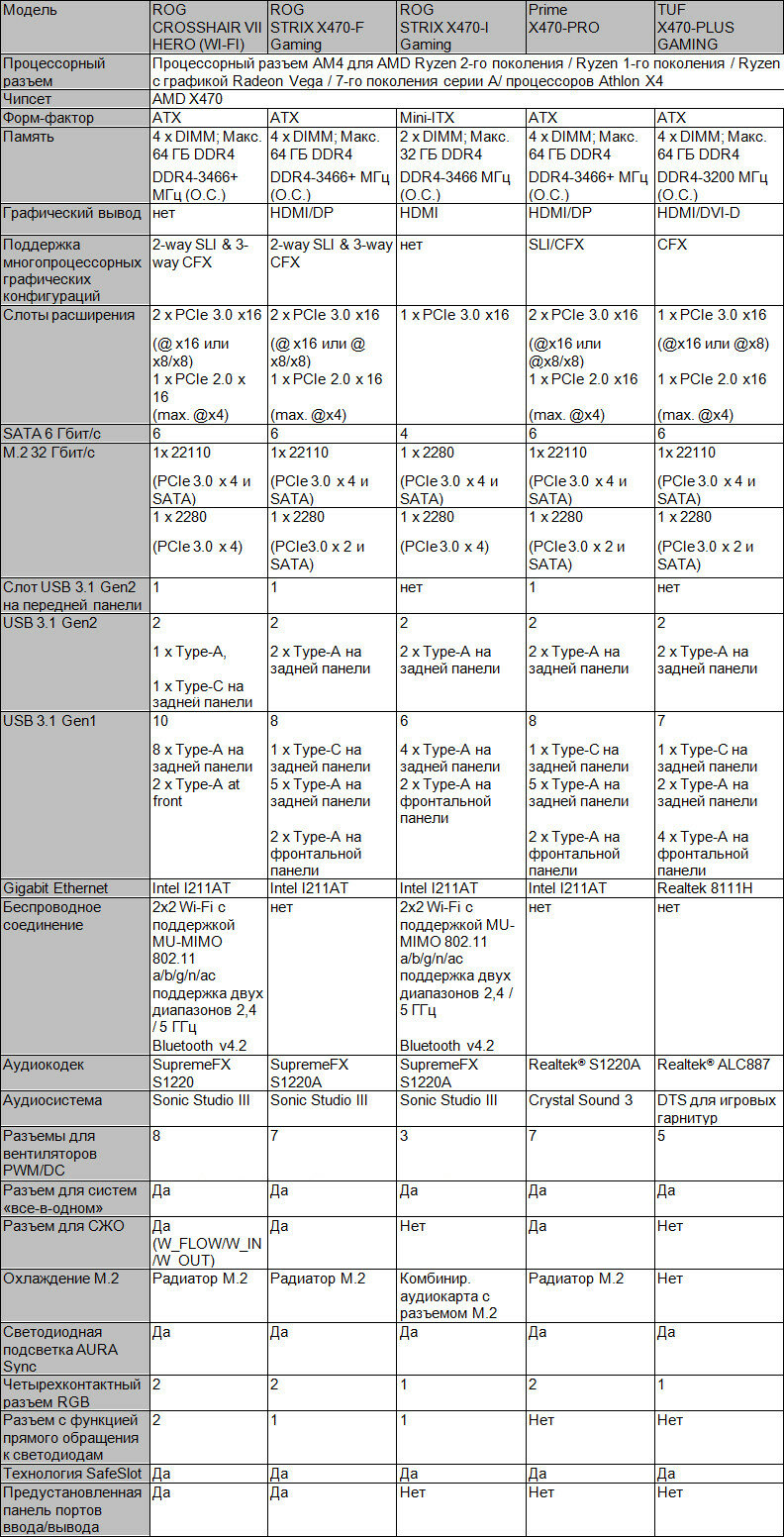 Возглавляет линейку модель ROG Crosshair VII Hero (и ее версия с модулем Wi-Fi), предназначенная в первую очередь для оверклокеров, энтузиастов и геймеров. Материнская плата Strix X470-F Gaming позволяет получить передовые возможности настройки и персонализации по доступной цене, а плата Strix X470-I Gaming малого форм-фактора mini-ITX предназначена для создания мощных, но компактных систем.