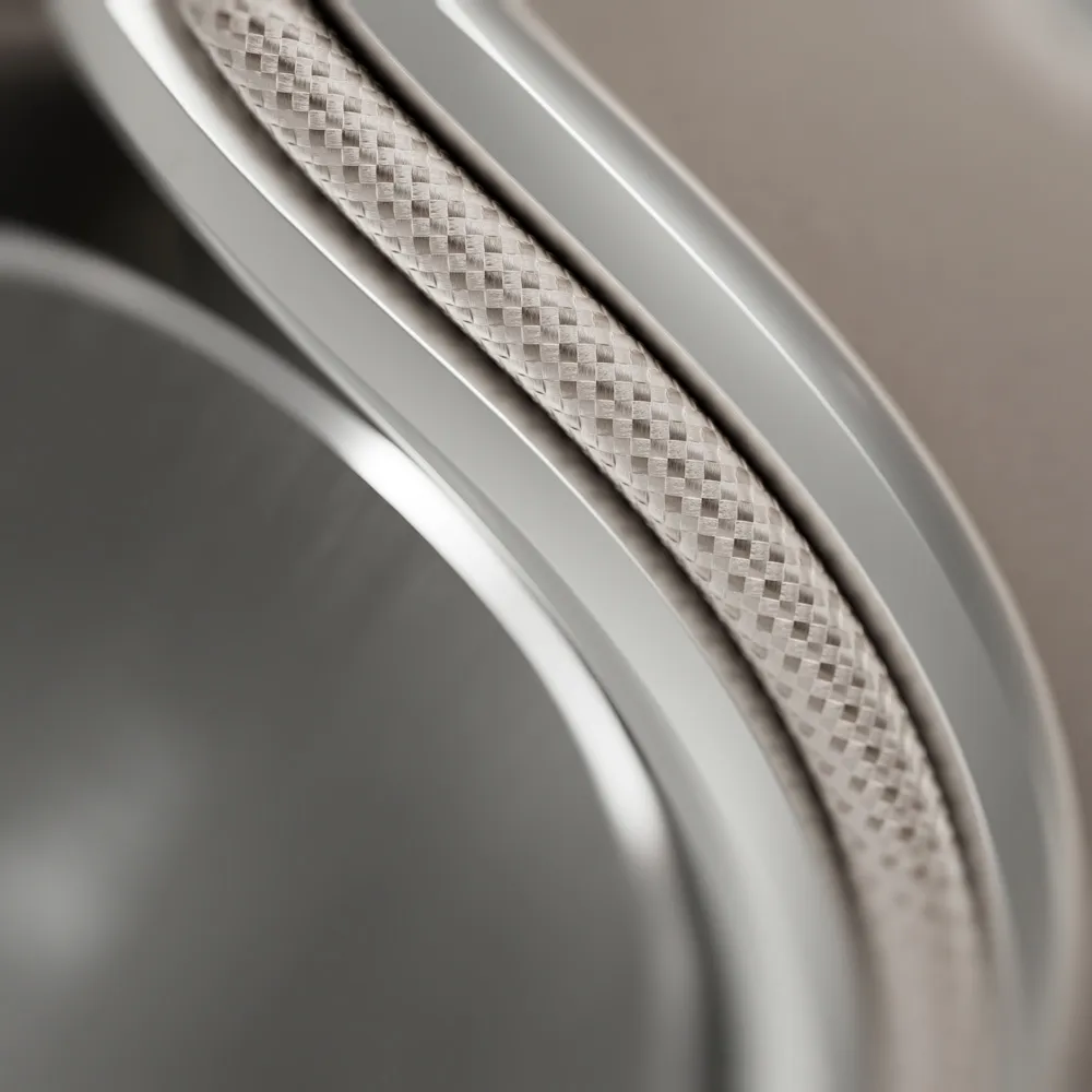 Блестящие алюминиевые дужки надежно удерживают амбушюры с оголенным плетеным кабелем. Для оголовья и амбушюр вместо заменителя использована кожа наппа. Доступны два варианта отделки: черный оникс и теплый камень.