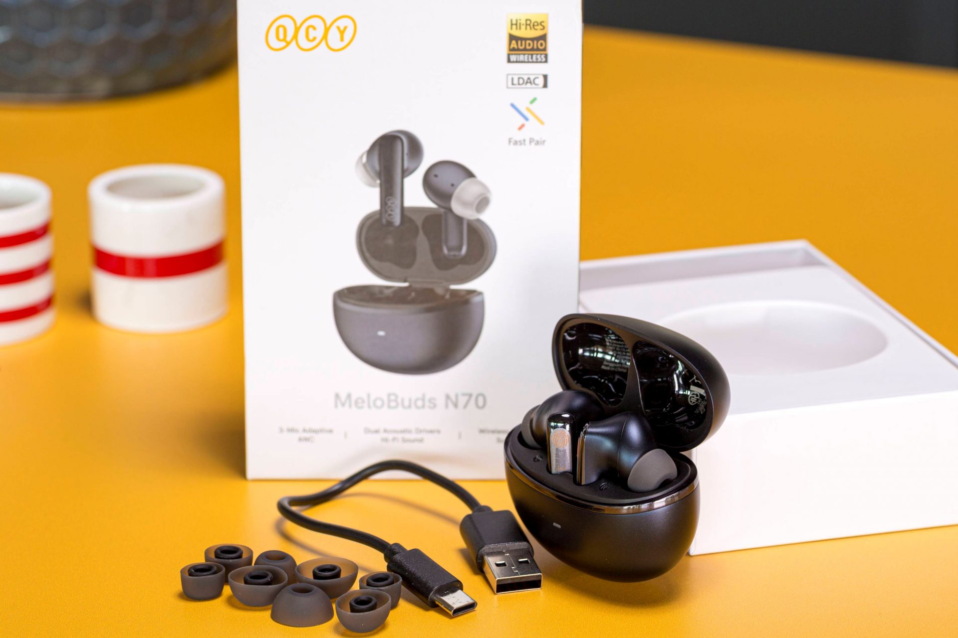 MeloBuds N70 поставляются с пятью размерами двухслойных силиконовых насадок в коробке, а также с USB-кабелем.
