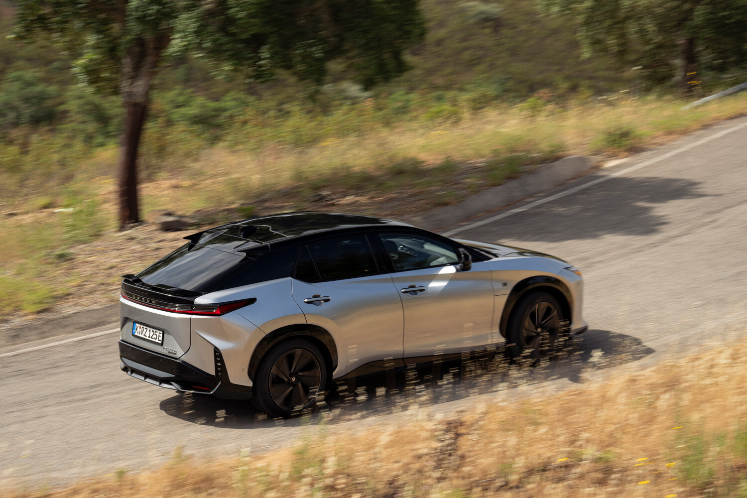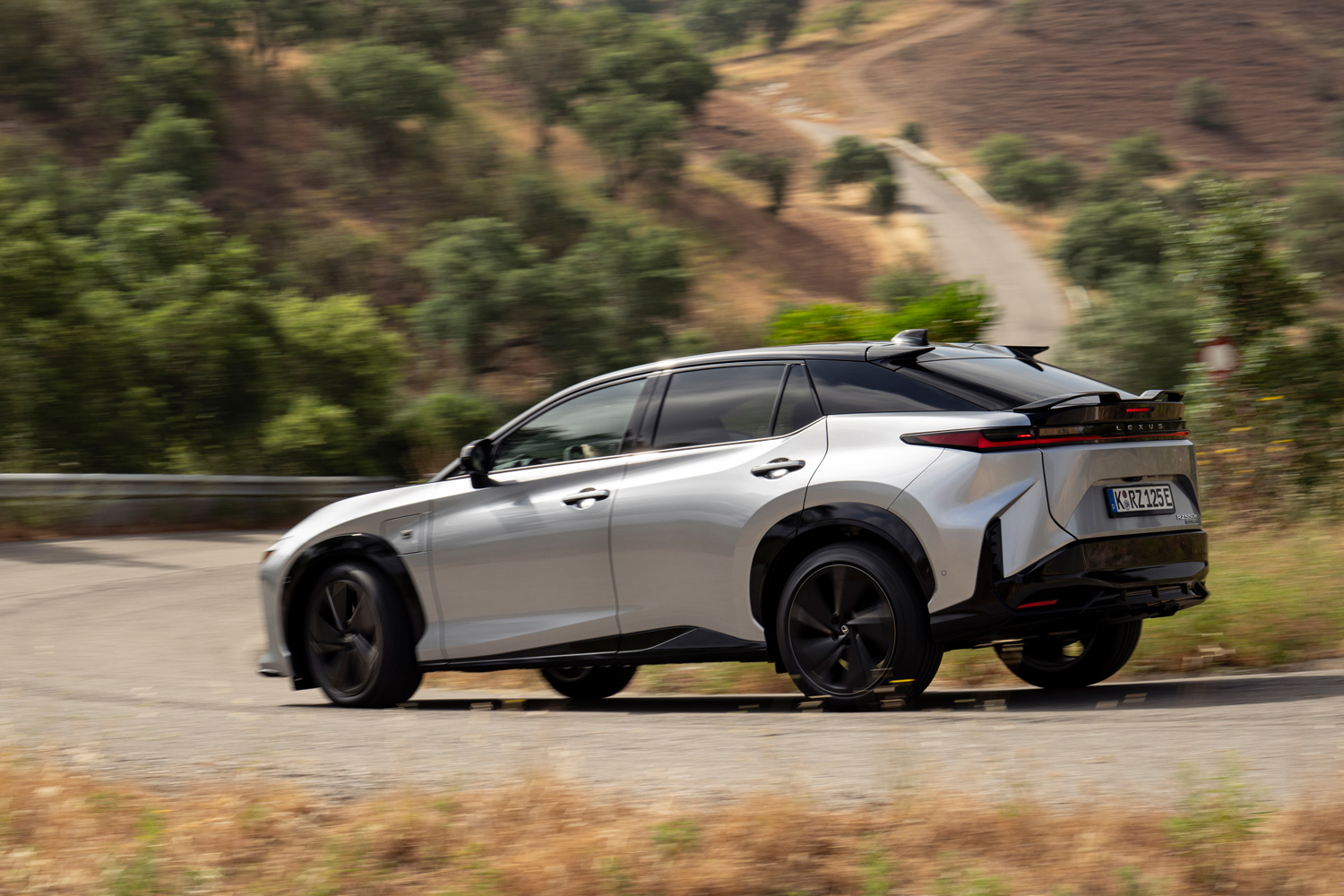 Здесь достаточно мощности: RZ500e обеспечивает отличное ускорение и достойную максимальную скорость. В комплектации F Sport также есть система интерактивного ручного управления, то есть возможность переключать передачи вручную с помощью подрулевых лепестков. Это работает, но не избавляет от ощущения, что это просто уловка. Это, конечно, не так убедительно, как переключение передач в Hyundai Ioniq 5 N. Большая батарея, естественно, увеличивает вес автомобиля, поэтому он кажется довольно тяжёлым при прохождении крутых поворотов на скорости.
