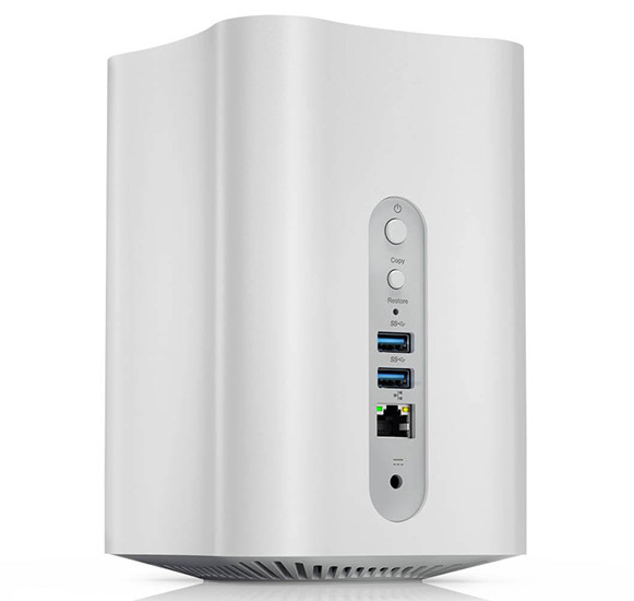 Далее по списку файлохранилище Smart Storage ценой в 130 долларов. Оно базируется на процессоре Celeron N3060 и располагает слотом для 3,5-дюймового жесткого диска с интерфейсом SATA. Есть пара портов USB 3.0 и клавиша копирования: подключил флешку, нажал на кнопку – и ее содержимое оказалось на винчестере. Возможно и беспроводное соединение: хранилище поддерживает двухдиапазонный Wi-Fi для подключения к домашней сети и удаленного доступа с различных устройств.