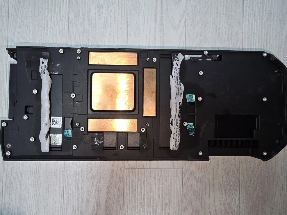 Внутри мы видим медную опорную пластину и массивную систему тепловых трубок, явно предназначенную для работы с высокими температурами и большими нагрузками. Внутренняя компоновка этой модели существенно отличается от 7900 XTX, что ещё раз подтверждает, что она была предназначена для более мощной конфигурации. Обратите внимание, что внутри не было печатной платы, поэтому её нельзя было подключить к ПК для дальнейшего тестирования. На задней панели кулера также отсутствуют какие-либо порты ввода-вывода, поэтому мы не можем (точно) предположить, какая модель там должна была быть установлена.