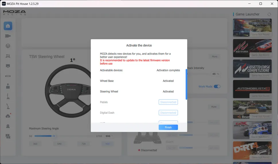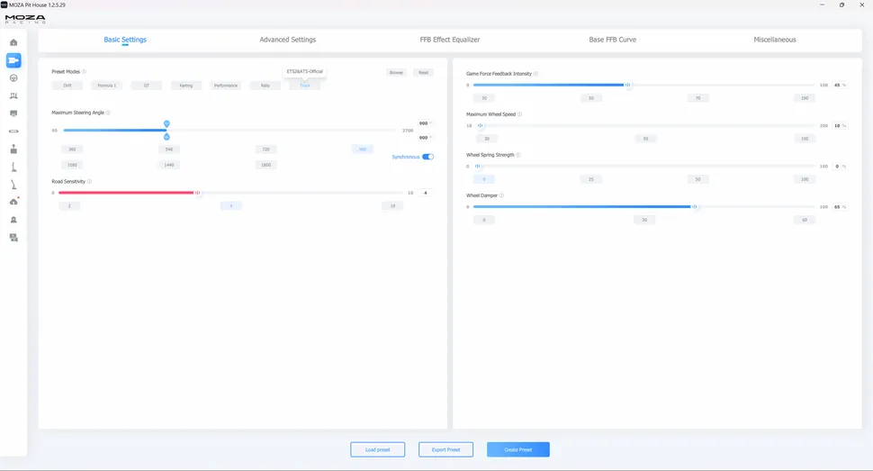 Pit House может распознавать и активировать каждую часть гоночной системы MOZA по отдельности, что приводит к появлению уведомлений о доступных обновлениях прошивки. Я не буду подробно описывать каждую из расширенных функций обратной связи по усилию (FFB). Однако я с радостью отмечу превосходный предустановленный режим «Грузовик», который отлично работает с автоматической настройкой для Euro Truck Simulator 2 и American Truck Simulator, если обнаруживает эти игры.