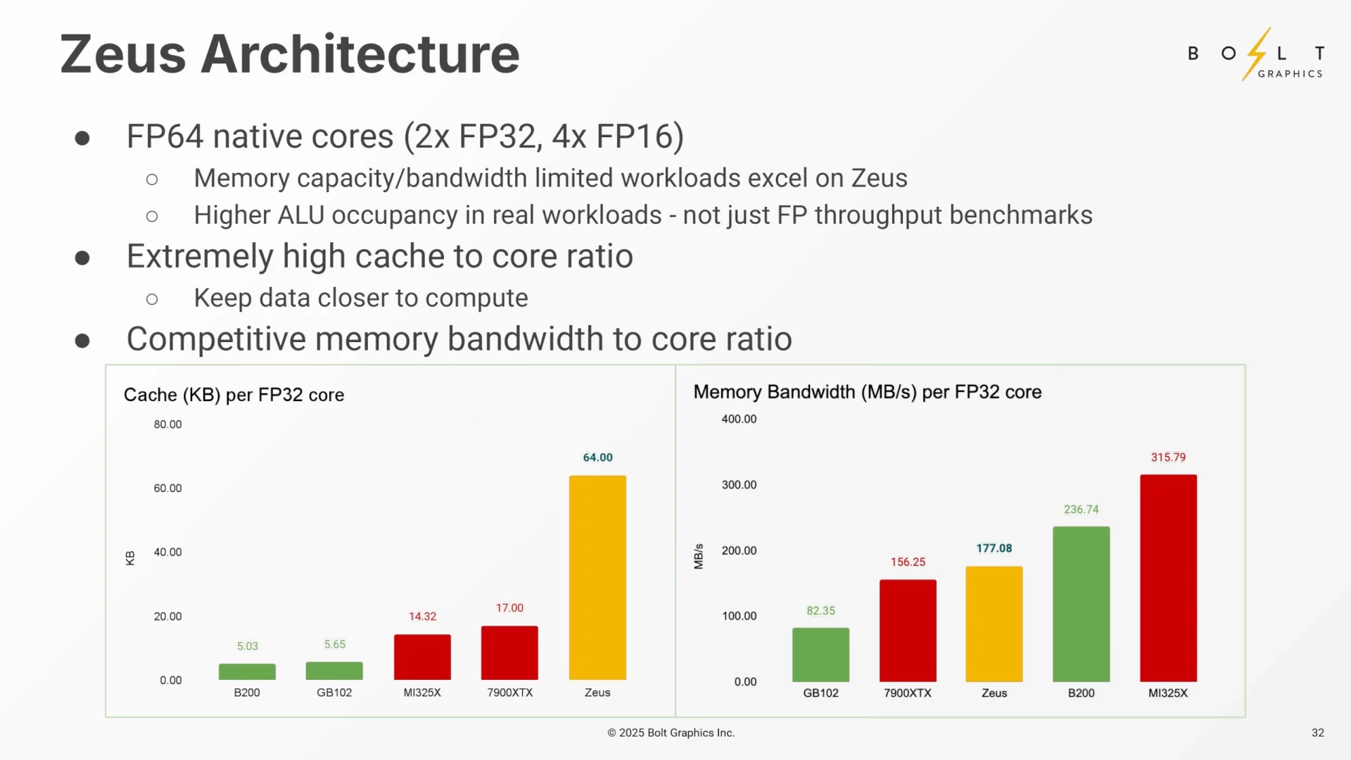 Что касается игр, то, по мнению Bolt Graphics, их графический процессор Zeus значительно превосходит RTX 5090 в трассировке лучей: производительность в 2,5 раза выше (77 против 32 гигалучей), а энергопотребление на 80 % ниже (120 против 575 Вт). Я, конечно, не сомневаюсь, что можно создать узкоспециализированный чип только для трассировки лучей, но это само по себе не делает его идеальным для игр. Например, производительность FP32 имеет решающее значение, поскольку в современных играх почти всё делается с помощью вычислительных шейдеров.