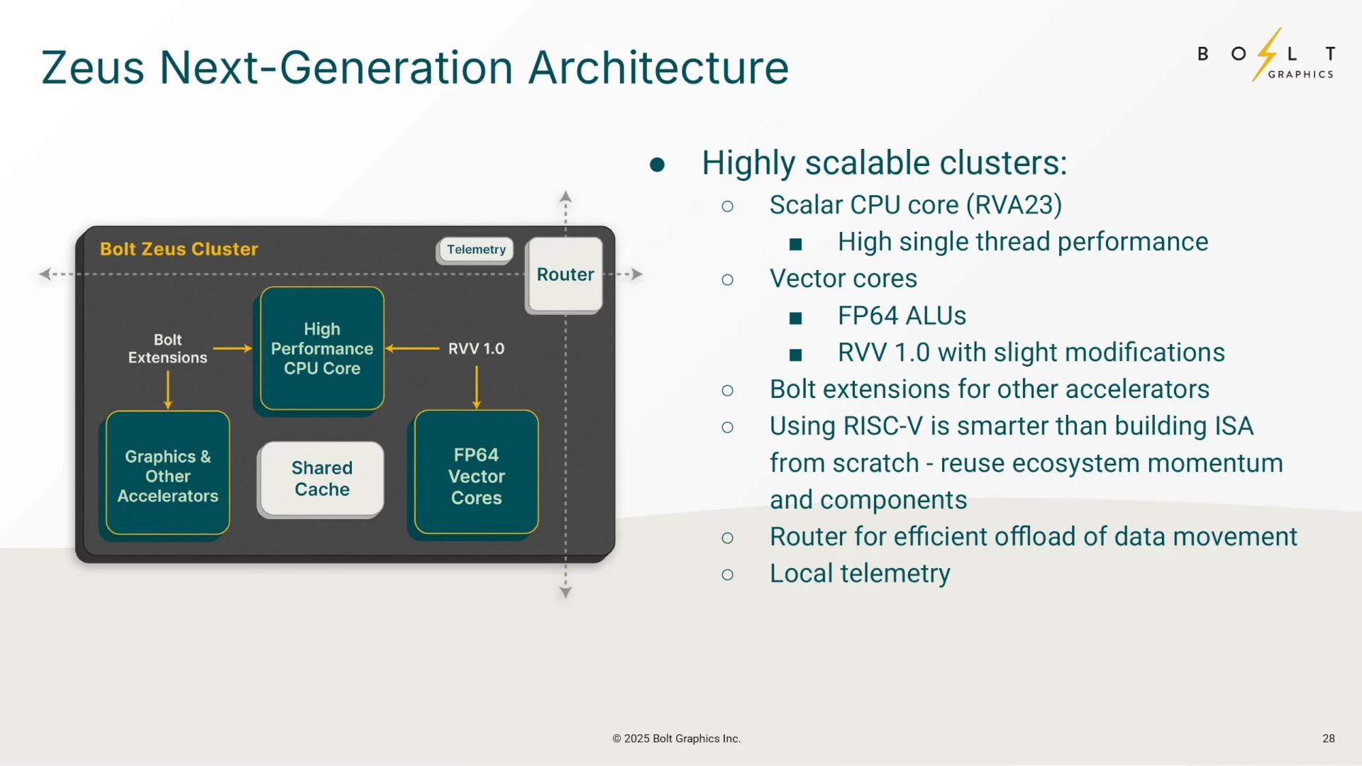 В основе новой конструкции лежит кластер Bolt Zeus — модуль, состоящий из однопоточного центрального процессора с отдельным векторным ядром с арифметико-логическим устройством FP64. В модуле есть большой объём кэш-памяти, а также «графические и другие ускорители» и маршрутизатор (да, действительно) для перемещения данных.