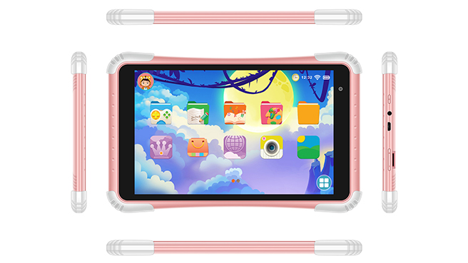 Модель заключена в корпус розового или голубого цвета с прорезиненными вставками на углах. Они, с одной стороны, предохраняют планшет во время падений, а с другой – предохраняют еще и ребенка: если он уронит устройство на себя, то резина смягчит удар.