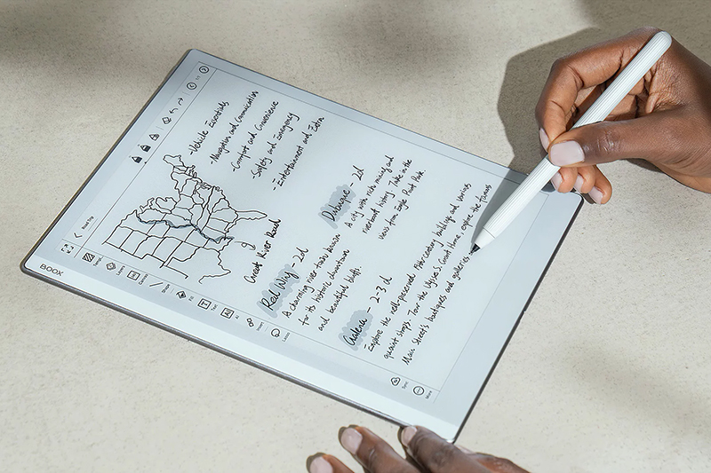 Черно-белый экран выполнен по технологии E Ink Carta 1200 и имеет разрешение 2480 x 1860 точек (300 ppi). У дисплея два сенсорных слоя: первый емкостный, что позволяет управлять ридером с помощью пальцев, а второй – индукционный. Последний предназначен для работы с фирменным пером. Оно входит в комплект поставки и может примагничиваться к корпусу ридера.