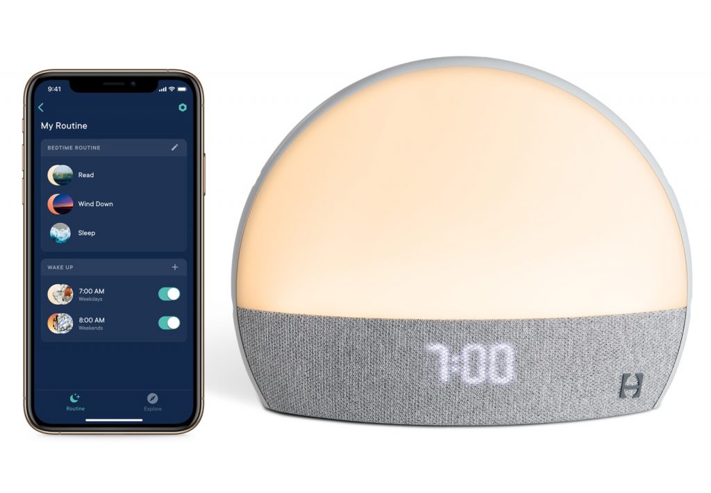 Особенности: Управление через приложение или касанием поверхности | 22 светлых оттенка свечения | 30-минутный постепенно нарастающий сигнал будильника на рассвете. Hatch Restore — это звуковая машина, будильник на рассвете, умный светильник, режим для медитации и просто будильник — все в одном устройстве. Одной из его выдающихся особенностей является подсветка: аппарат может выполнять роль лампы для чтения; здесь есть режим мягкого, успокаивающего ночного света и постепенное нарастающее свечение, которое позволяет вам просыпаться со светом, а не под неприятные звуки. Конечно, если вам все же требуется звуковое сопровождение вашего пробуждения, в Hatch Restore есть такие звуки, как нежный перезвон и звуки природы, которые мягко разбудят вас ото сна. Есть также медитативная музыка, которую вы можете слушать сразу после пробуждения или прямо перед сном, а также советы о том как погрузиться в сон, если вам нужна дополнительная помощь при засыпании. Несмотря на то, что будильник Hatch довольно дорог, с учетом всех функций, которые вы получаете с ним, он вполне стоит своих денег. Одним из недостатков этого будильника является то, что его размеры довольно велики и аппарат эаймет значительное место на вашей тумбочке.