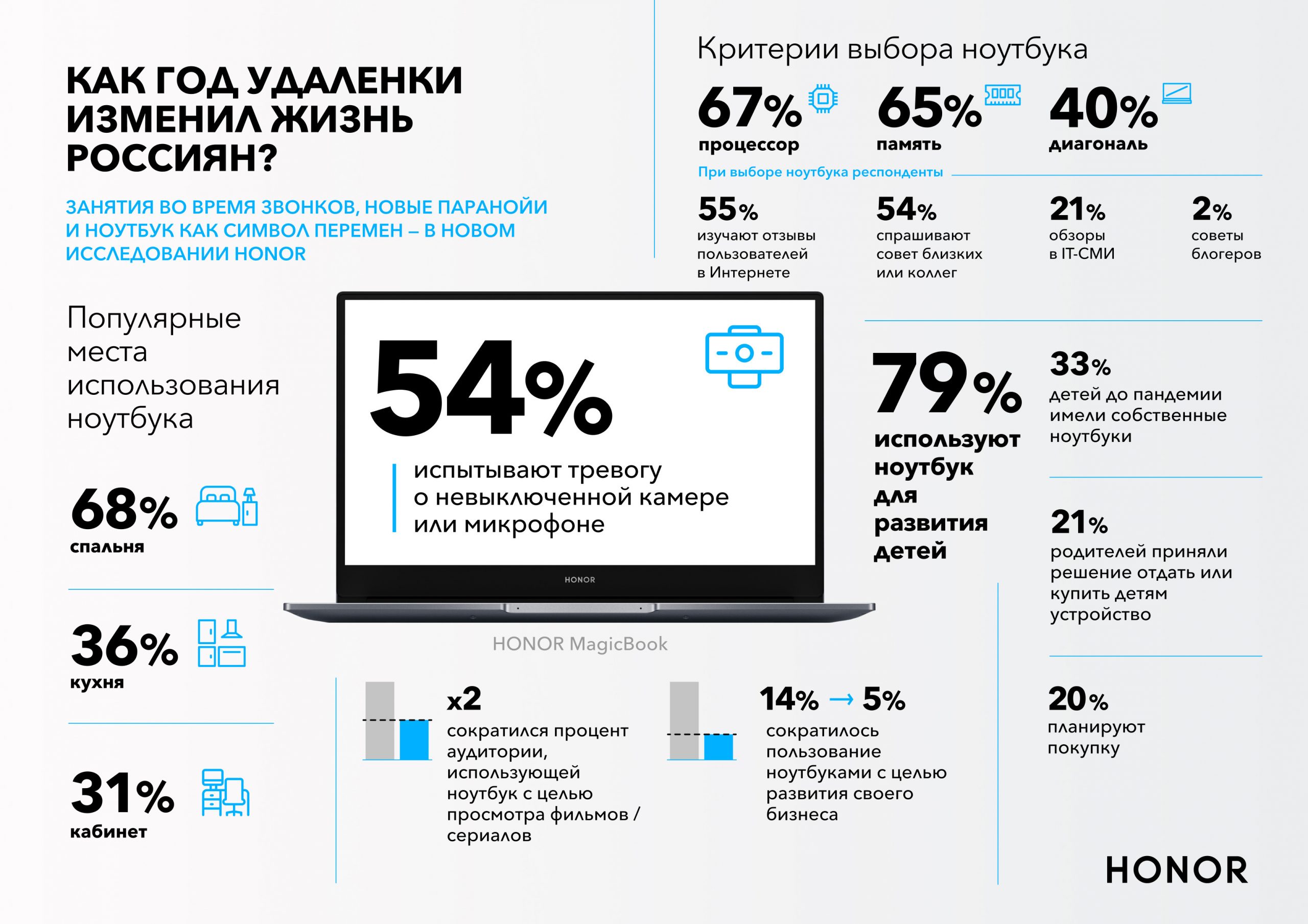 Honor провел опрос среди трех тысяч пользователей ноутбуков и выяснил, как россияне выбирают устройства такого рода, а также что изменилось в процессе использования лэптопов в результате самоизоляции.
