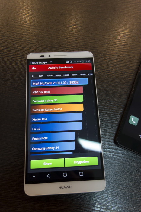 Впечатление от аппаратной части — сугубо положительное. Отличный экран, высокая производительность, традиционно приличная камера (она такая же, как в Ascend P7). Работает все на собственном 8-ядерном процессоре, и в бенчмарках аппарат рвет все анонсированное до 3 сентября.