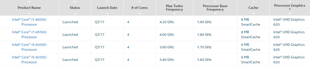 Всего представлено четыре чипа: Core i7-8650U, Core i7-8550U, Core i5-8350U и Core i5-8250U. Все они базируются на архитектуре Kaby Lake R (Refreshed) с техпроцессом 14 нм +, являющейся обновленной версией архитектуры Kaby Lake, которая применялась в седьмом поколении Core. Позже в линейку Core восьмого поколения войдут процессоры Coffee Lake (14 нм ++) и Cannon Lake (10 нм).