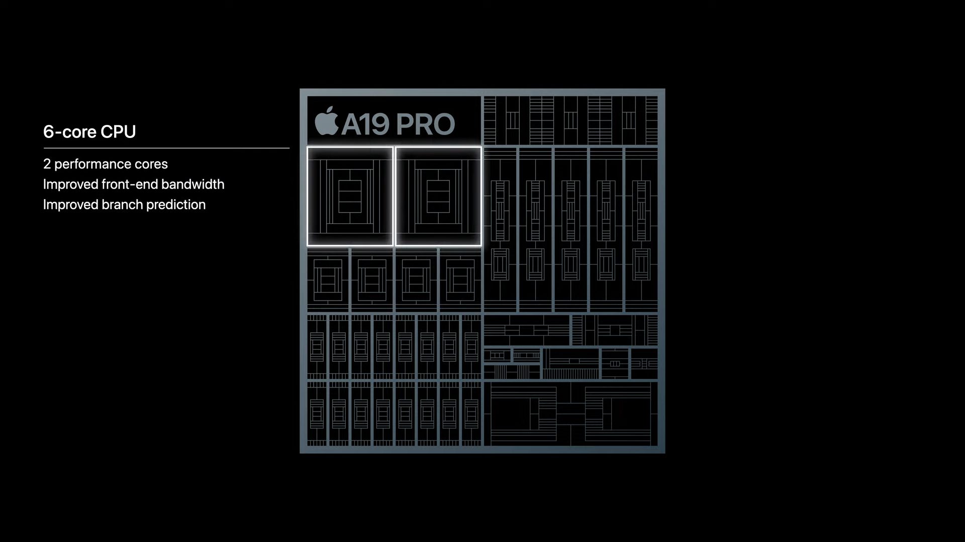 Итак, давайте разберем A19 Pro и посмотрим, что у него внутри. Он создан по 3-нм техпроцессу с безумным количеством транзисторов, имеет 6-ядерный ЦП (2 производительных и 4 эффективных ядра) и 5-ядерный ГП с нейронными ускорителями на каждом ядре.