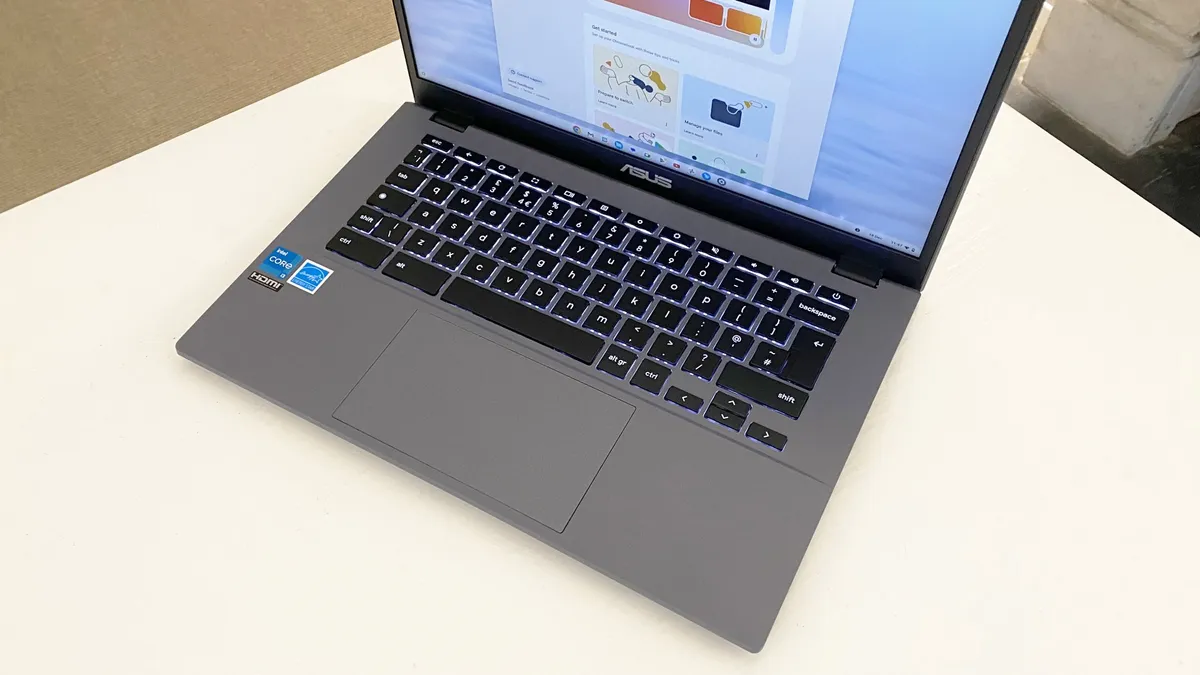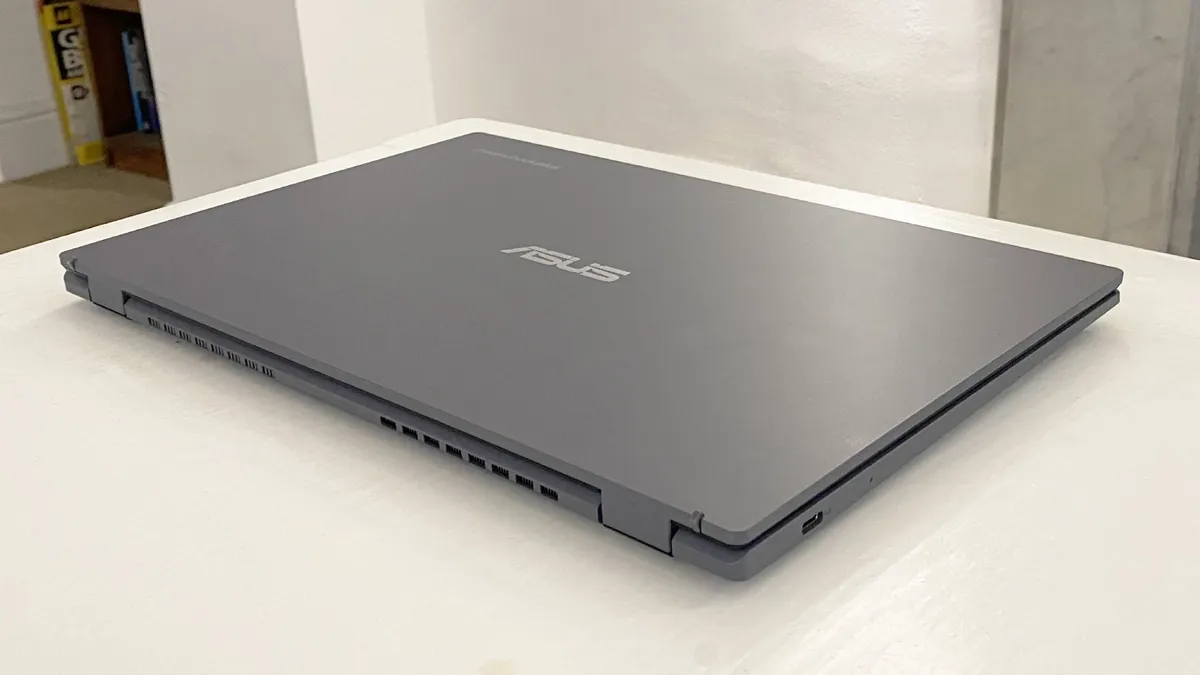 Дизайн Asus Chromebook Plus CX34 немного устарел, с довольно крупными рамками и квадратным корпусом.