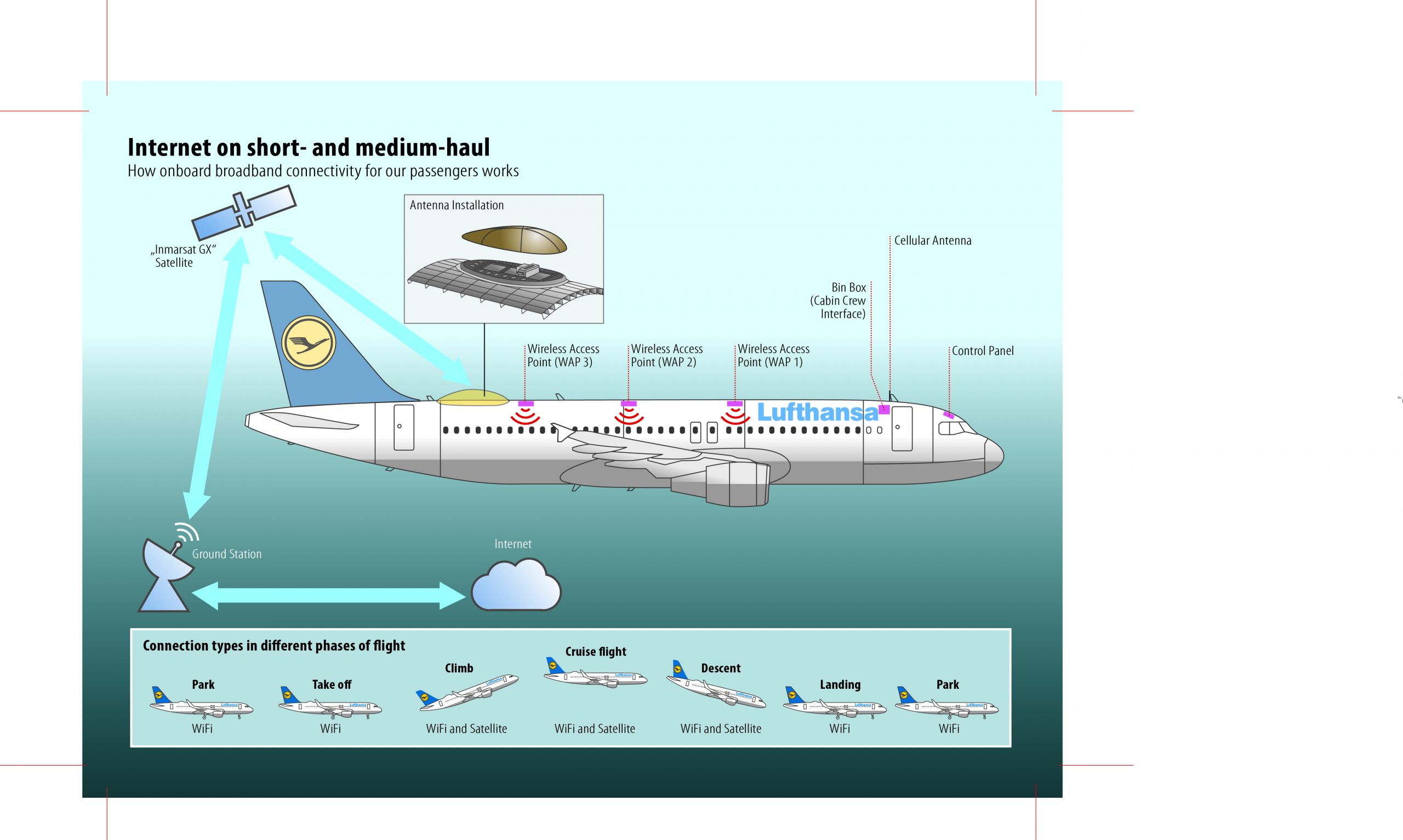 Услуга, которую будут предоставлять пассажирам Lufthansa и ее технологический партнер, компания Inmarsat, основана на применении самой современной широкополосной спутниковой технологии (Ка-диапазон) и обеспечивает полное надежное покрытие на маршрутах короткой и средней протяженности через спутниковую сеть Global Xpress Inmarsat. Пассажиры получат доступ к сети Интернет через WiFi, используя свои мобильные устройства. Кроме стандартного доступа к почте или работы в браузерах пассажиры смогут использовать более сложные приложения или смотреть потоковое видео. Позднее будет реализована возможность отправки sms-сообщений или передачи данных со своих мобильных телефонов.
