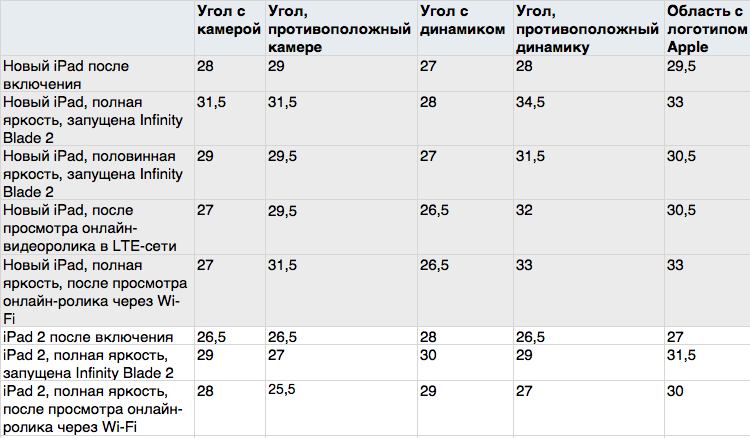 Тем не менее, независимая экспертиза, проведенная сайтом CNET, показала, что проблема существует. Специалисты вооружились специальным датчиком и сравнили новый iPad и iPad 2. Температура, приведенная в таблице, измерена с помощью инфракрасного термометра и указана в градусах Цельсия.
