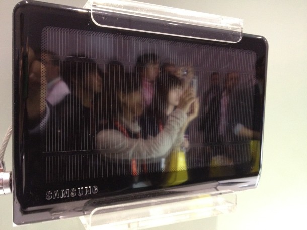 Наконец, на самом краю стенда Samsung, мы заметили концепт нетбука NC215S с солнечными батареями на базе процессора Intel Atom! Солнечная панель интегрирована в крышку лэптопа.