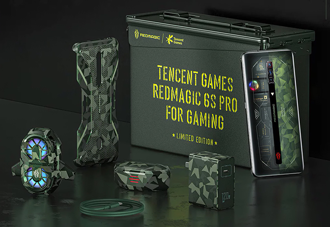 Спецверсия снабжена 18 Гбайт оперативной и 512 Гбайт встроенной памяти, поставляется в крупной металлической коробке и имеет расширенную комплектацию. Она включает чехол, 120-ваттное супербыстрое зарядное устройство, охлаждающую накладку с парой вентиляторов и игровые наушники Red Magic TWS, причем все эти аксессуары также имеют камуфляжную расцветку.