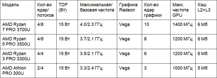 Еще AMD представила двухъядерный четырехпоточный чип Athlon Pro 300U, предназначенный для доступных ноутбуков. С характеристиками всех новых процессоров можно ознакомиться ниже.