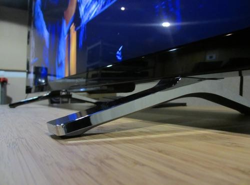 Клиновидная конструкция понижает центр тяжести телевизора, позволяя использовать небольшую металлическую опору вместо традиционной во всю ширину корпуса. Подставка устанавливается в два положения – ближе к концам или к центру – и подойдет для большинства стоек под ТВ.