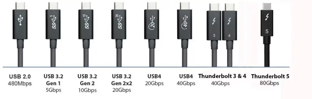 Если не брать в расчёт Thunderbolt 1.0 и Thunderbolt 2, в которых использовались разъёмы mini-DisplayPort, то Thunderbolt 3, 4 и 5, а также USB4 выглядят точно так же, как USB-C, но работают намного быстрее: 40 Гбит/с (= 5 Гбит/с = 5000 Мбит/с = 40 000 Мбит/с) для TB3 и TB4 и до 120 Гбит/с (= 15 Гбит/с = 15 000 Мбит/с = 120 000 Мбит/с).