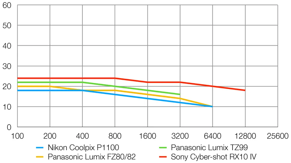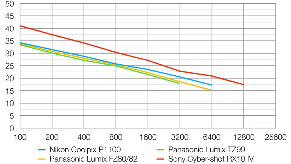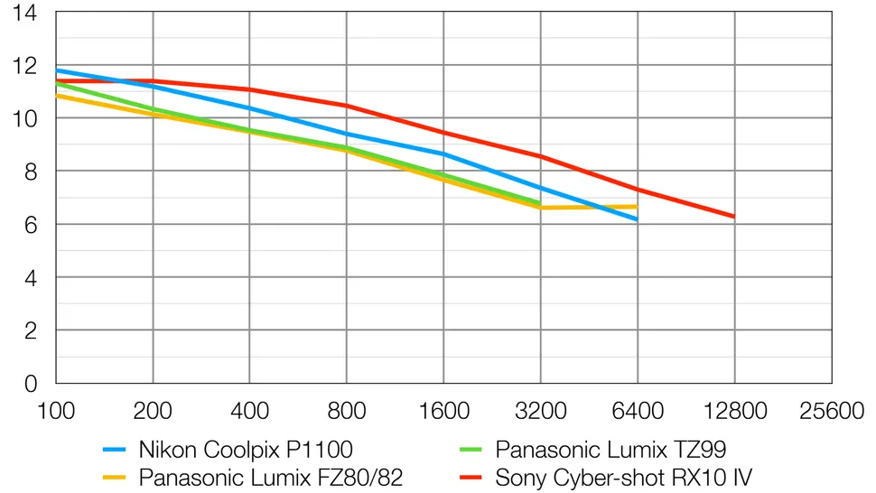 Обычно мы не тестируем в лаборатории камеры с небольшими сенсорами, такие как P1100, так как они, как правило, показывают не самые лучшие результаты, и часто у них нет возможности снимать в формате RAW, который нам необходим для объективного тестирования. Следовательно, у нас есть лишь ограниченный выбор камер с фиксированным объективом, с которыми можно сравнить P1100.Panasonic FZ80D/82D является ближайшим конкурентом, это псевдозеркальная камера с 60-кратным зумом и сенсором аналогичного размера. Panasonic Lumix TZ99 почти так же современен, как P1100, и также оснащён 1/2,3-дюймовым сенсором. Он может обеспечить только 30-кратный зум, но это впечатляет для такой маленькой камеры. Мы также включили сюда Sony RX10 IV, так как это лучшая псевдозеркальная камера, которая продаётся сегодня, благодаря относительно большому 1-дюймовому сенсору, обеспечивающему превосходное качество изображения.
