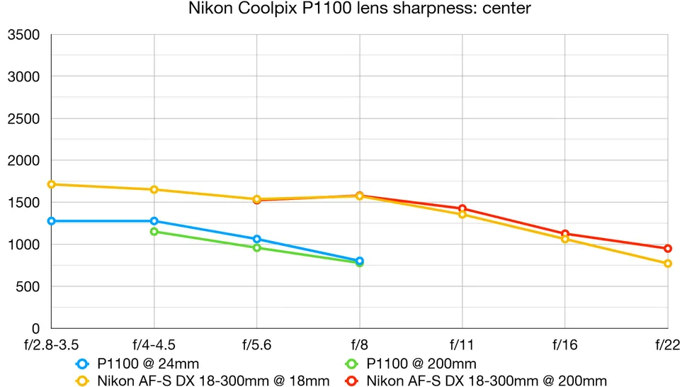 Поскольку мы никогда раньше не тестировали объектив на псевдозеркальной камере, в нашей базе данных нет ничего, с чем можно было бы напрямую сравнить P1100. Вместо этого мы включили для сравнения объектив Nikon с суперзумом APS-C (DX) — AF-S DX 18-300 мм f/3,5-5,6G ED VR, — который мы изначально тестировали на зеркальной камере Nikon D5500.