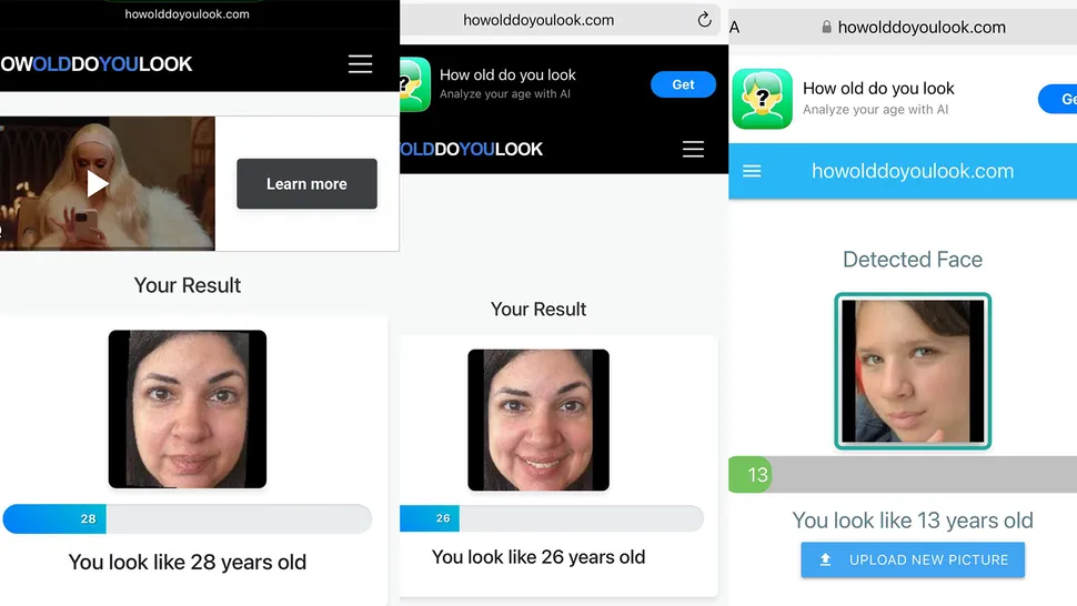 Кроме того, я вспомнила, что впервые использовала тот же ИИ прошлым летом вместе со своей дочерью, которой тогда было 13 лет. Я сохранила скриншоты, но, хотя howolddoyoulook.com правильно определил возраст моей дочери как 13 лет (возможно, с детьми это происходит проще?), мне он сказал, что мне 24 года!