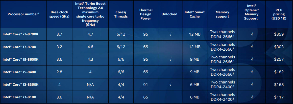 Флагманом десктопной линейки Core восьмого поколения является чип Core i7-8700K с шестью вычислительными ядрами, которые могут разгоняться до 4,7 ГГц в турборежиме. Также в Intel отмечают, что в семейство вошли первые шестиядерные процессоры Core i5 и первые четырехъядерные Core i3 (ранее версии этих чипов для десктопов имели максимум по четыре и два ядра соответственно).