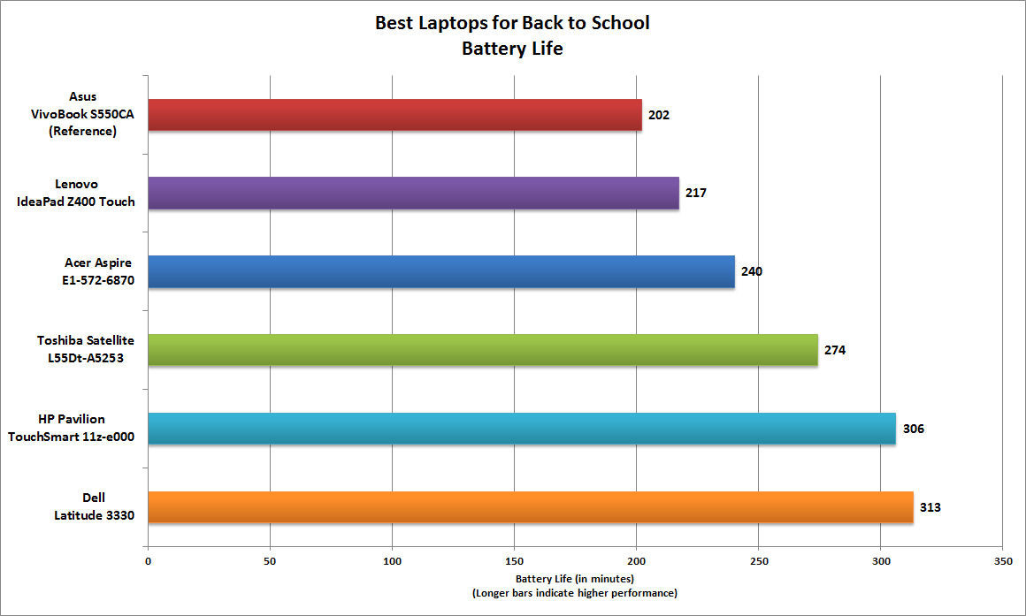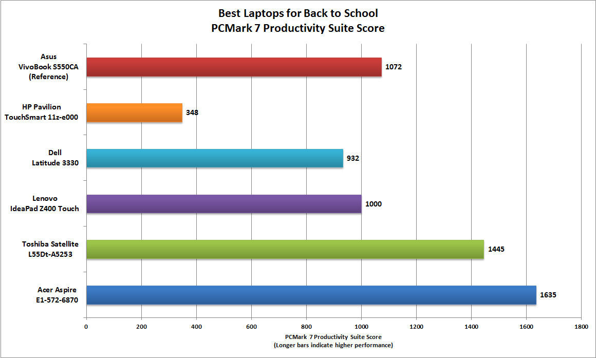 При выполнении группы тестов Notebook WorldBench 8.1 компьютер Acer продемонстрировал самую высокую производительность, опередив даже эталонный образец Asus VivoBook S550CA, оснащенный сенсорным экраном и твердотельным накопителем (причем стоит модель Asus дороже любого компьютера, представленного в нашем обзоре). При проверке эффективности функционирования отдельных компонентов ноутбук Acer опередил других участников нашего конкурса в тесте PCMark Productivity, однако с задачами кодирования и редактирования мультимедийных файлов лучше справилась модель Lenovo IdeaPad Z400, оснащенная быстрым жестким диском большего объема.