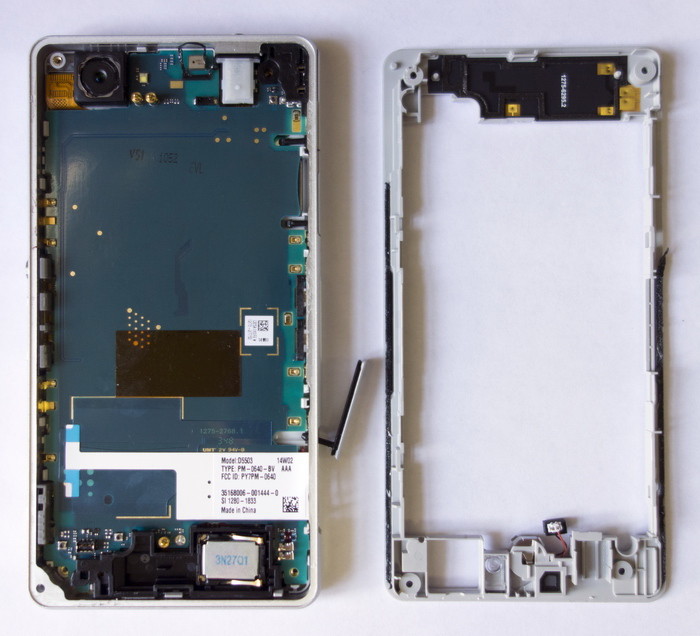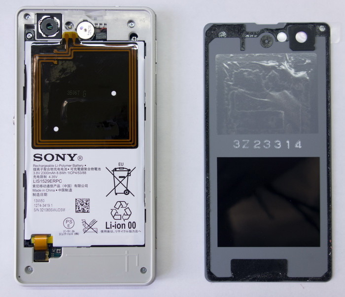 Под крышкой нас встречают NFC-антенна и аккумулятор емкостью 2300 мА-ч. Это меньше 3000 мА-ч в Z1, но и площадь экрана существенно уменьшилась, так что на подсветку надо тратить меньше энергии.