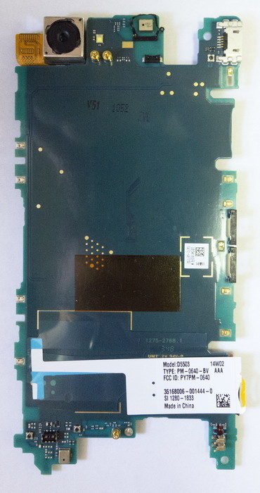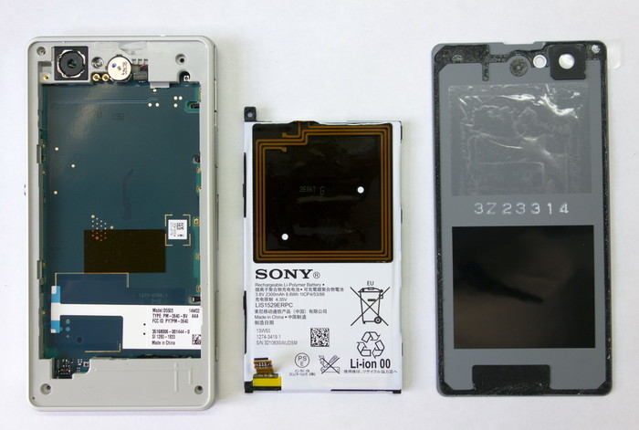По габаритам Z1 Compact сравним с iPhone 5 (внешнее сравнение с большим Z1 можно посмотреть здесь). Задняя крышка у него, в отличие от большой модели, не стеклянная, а пластиковая. Это не хорошо и не плохо, но себестоимость, скорее всего, немного ниже. Держится она на двустороннем скотче, и чтобы снять крышку, аппарат надо погреть специальным феном или подержать на паяльной станции. Мы с мастером Левченко выбрали второй вариант.
