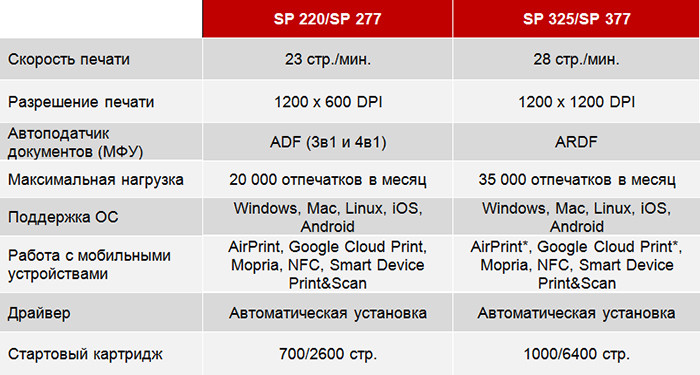 Принтеры и МФУ Ricoh SP 220/SP 277 печатают до 23 страниц в минуту, а SP 325/SP 377 – до 28 страниц в минуту и поддерживают дуплексную печать, что позволяет сразу печатать на двух сторонах листа и таким образом экономить время. Максимальная месячная нагрузка для устройств серий SP 220/SP 277 составляет 20 тысяч отпечатков, а для линейки SP 325/SP 377 – 35 тысяч отпечатков.