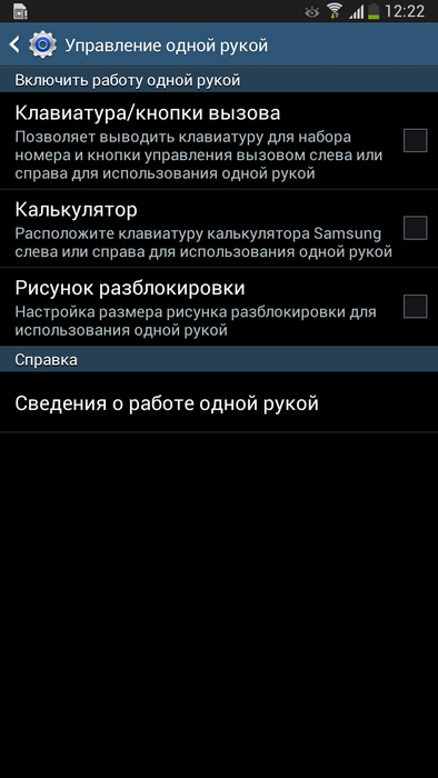 В меню можно обнаружить зачатки адаптации управления огромным смартфоном под одну руку. Увы, пока это малореально. Но, кто знает, может со временем появятся новые опции