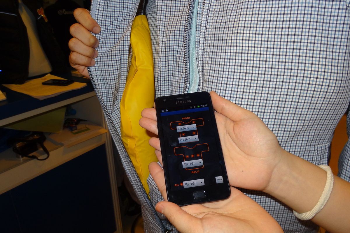 Прототип обнимающей куртки под названием T.Jacket компания демонстрирует на проходящей в Сингапуре выставке DEMO Asia, посетители которой могут попробовать действие товара на себе. T.Jacket представляет собой ветровку с вшитыми баллонами, которые по команде со смартфона надуваются электронасосом.