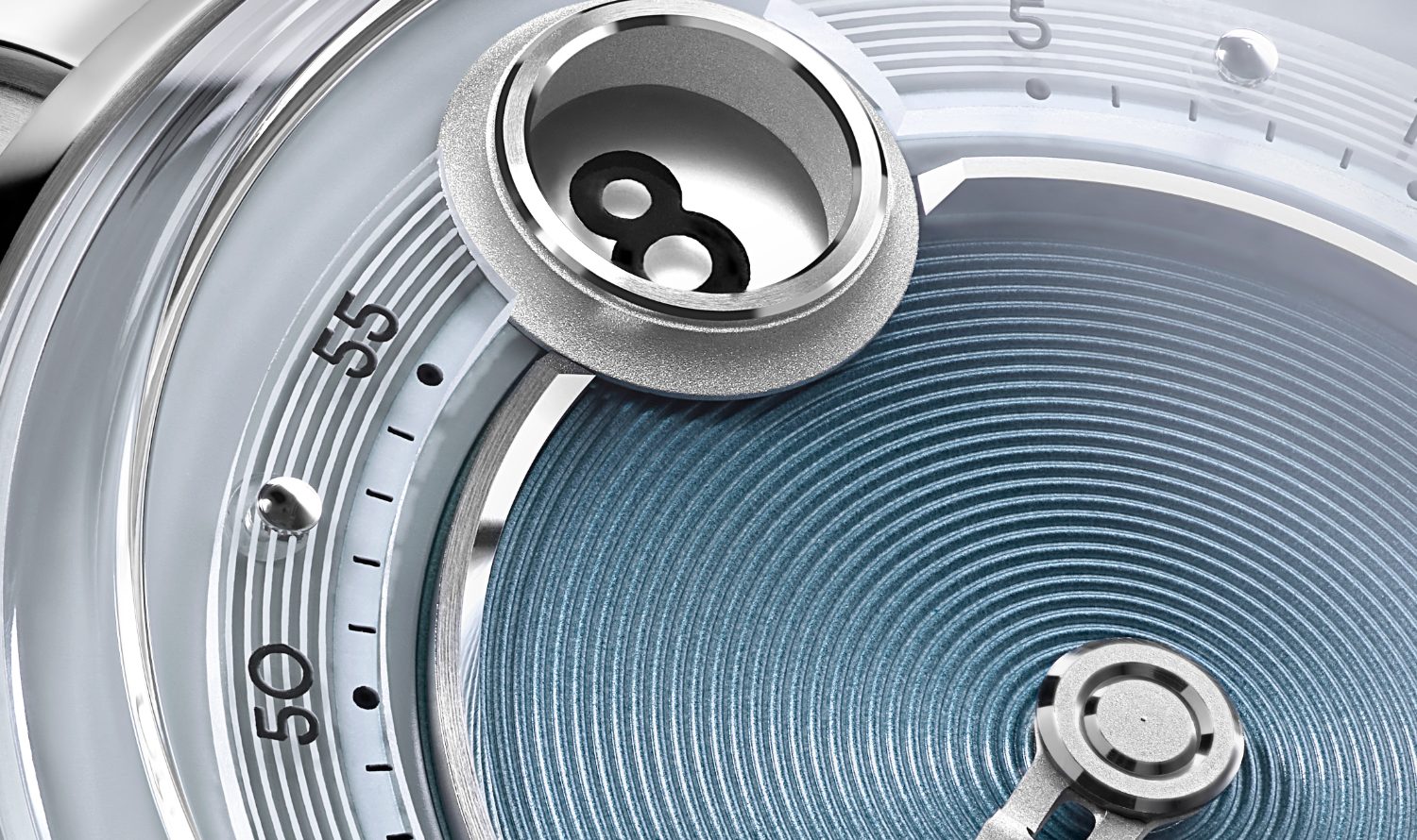 Полупрозрачное сапфировое кольцо циферблата сразу привлекает внимание. Оно украшено минутными метками, мягко светится синим цветом благодаря слоям Super-LumiNova и пропускает свет, который заряжает скрытое под ним часовое колесо. В результате подсвечивается только текущая цифра. Это изящное, уникальное и почти кинематографическое зрелище при каждом переключении часов.