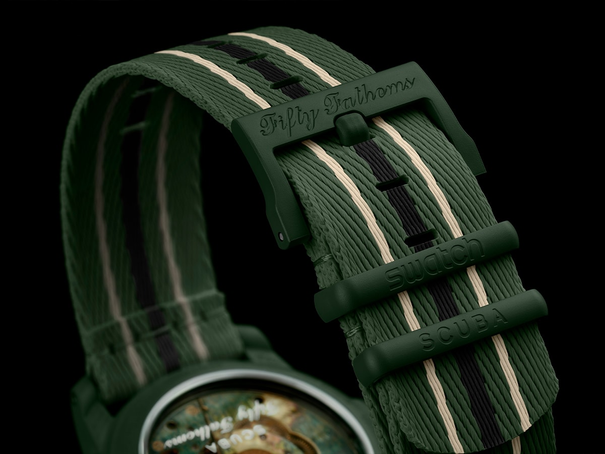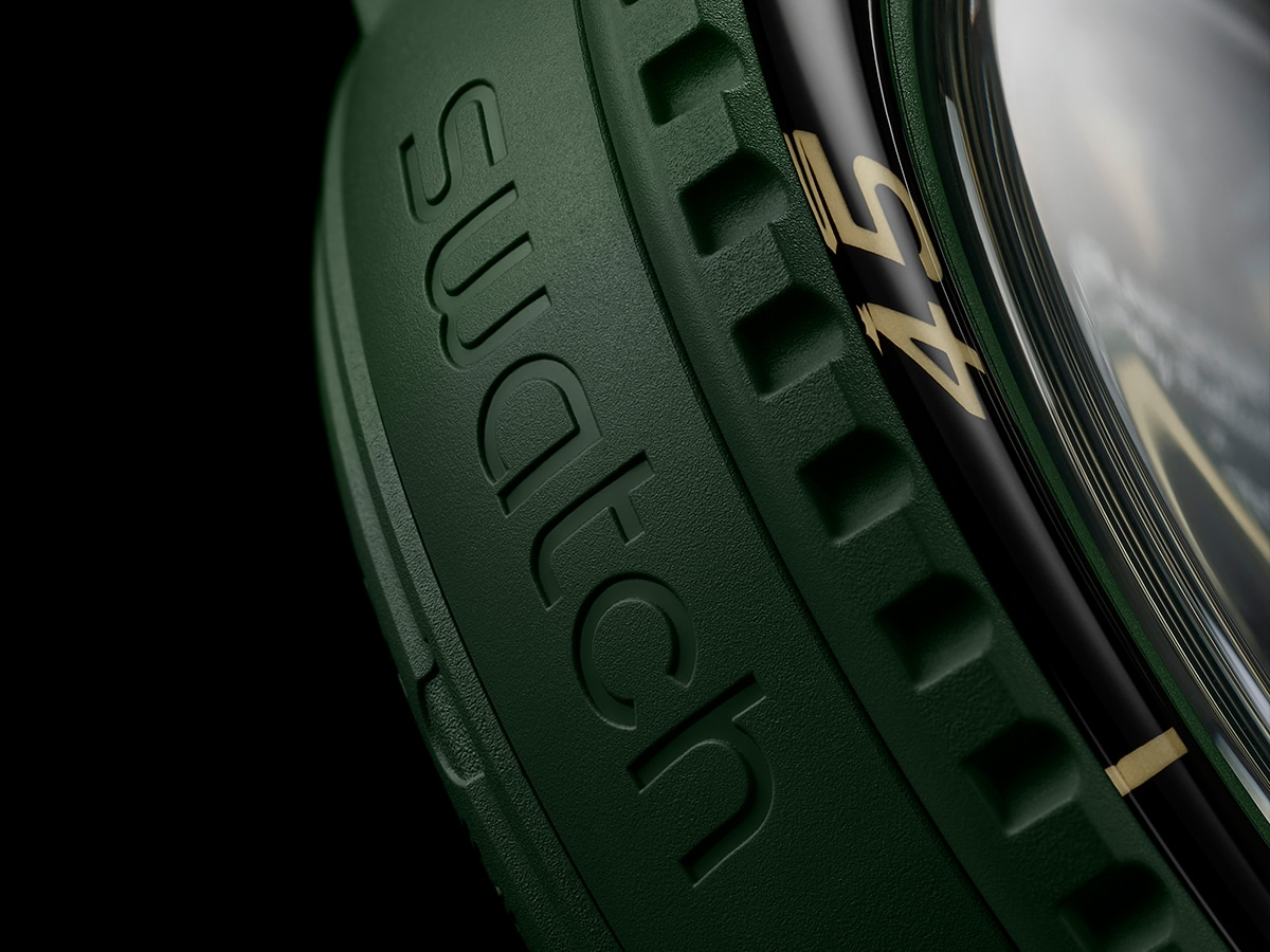 Ищите Blancpain x Swatch Bioceramic Scuba Fifty Fathoms ‘Green Abyss’ в магазинах Swatch с 7 июня 2025 года.