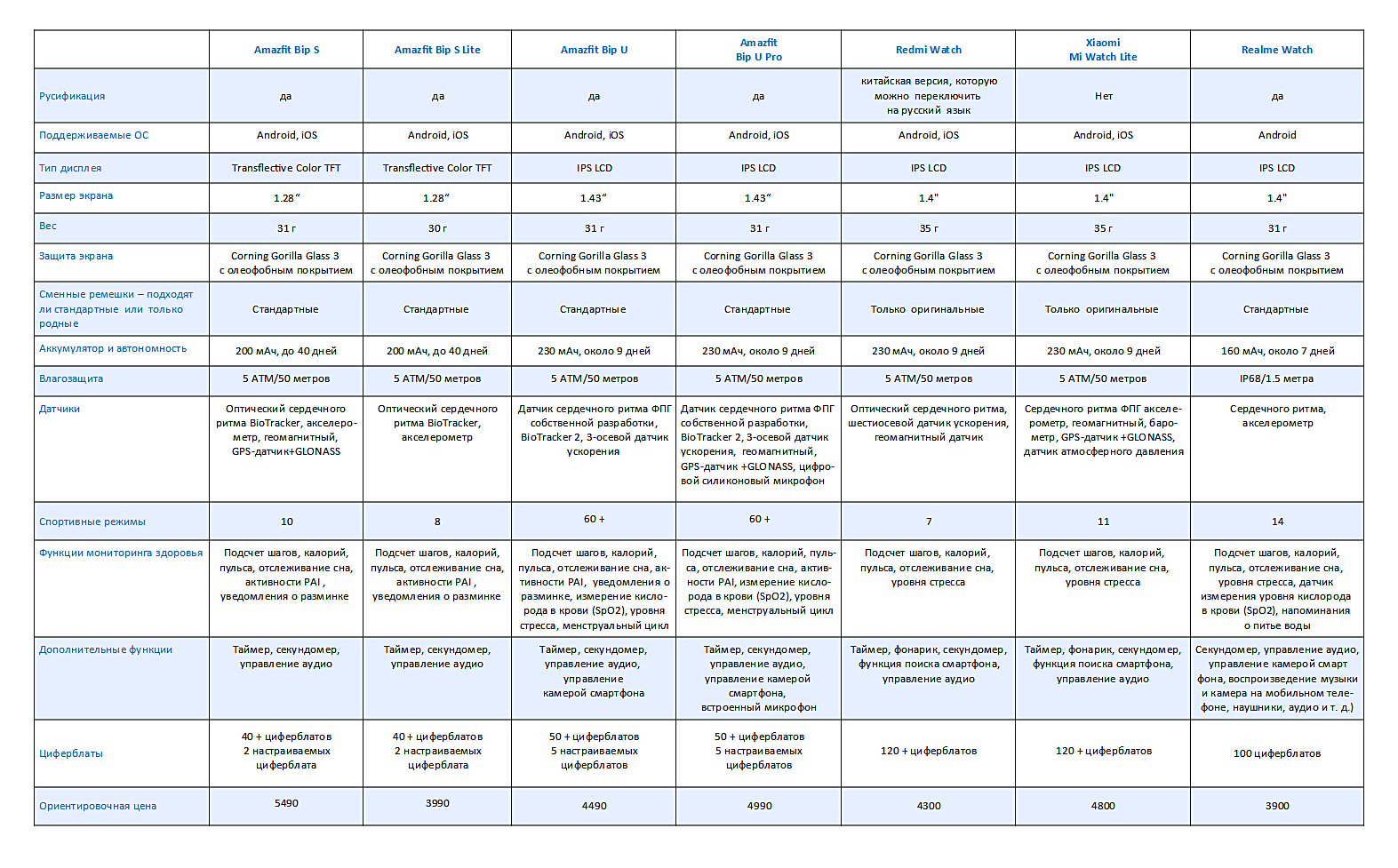 Практически обязательным в эпоху пандемии стало наличие функции измерения кислорода в крови, которой обзавелись практически все модели умных часов 2020 и 2021 года, в том числе недорогие — Bip U (Pro) и realme Watch. Еще одна полезная функция — отслеживание менструального цикла — пока встречается в недорогих умных часах крайне редко, но, например, в часах Amazfit Bip U она есть.