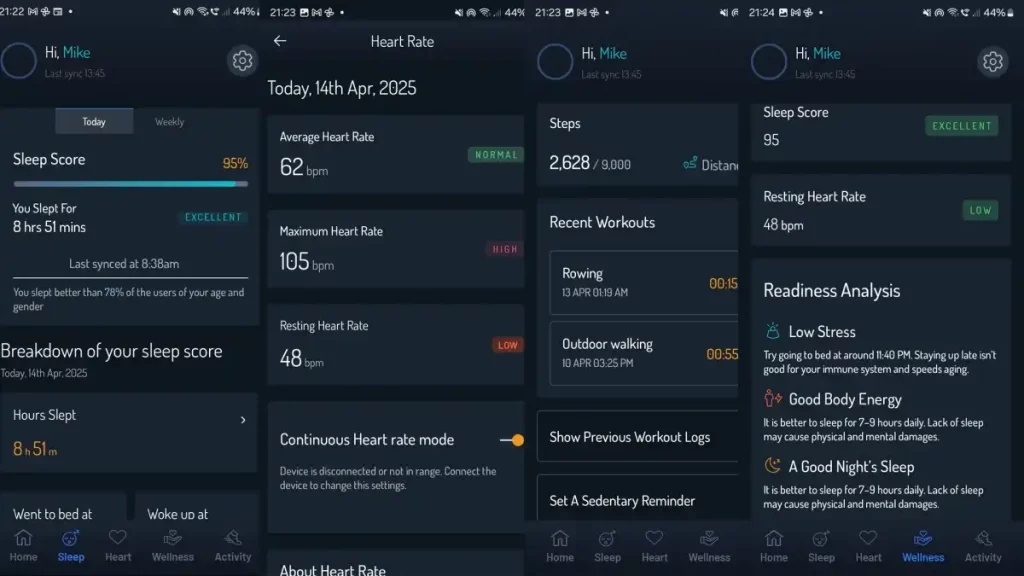 Изучив отслеживание активности, я не увидел ничего, что указывало бы на то, что такие данные, как количество шагов в день и количество активных минут, были сильно неточными. Обычно это было 200–500 шагов в рамках аналогичного отслеживания с помощью двух других фитнес-трекеров. Однако показатели сжигания калорий были значительно ниже, чем у других устройств.