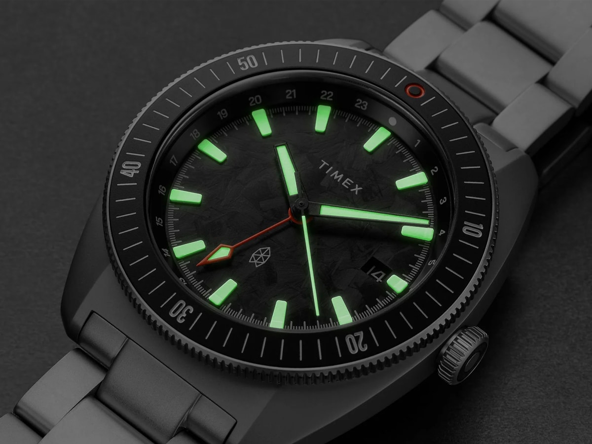 Timex снова зашёл с коллабой, которая реально радует глаз. Американская часовая компания вместе с The James Brand выпустила третьи совместные часы — James Brand × Timex Automatic GMT Nocturne Edition. Диаметр 41 мм, нержавейка и шикарное сочетание с текстурой углеродного волокна на циферблате и заводной головке — прям эстетика на уровне.