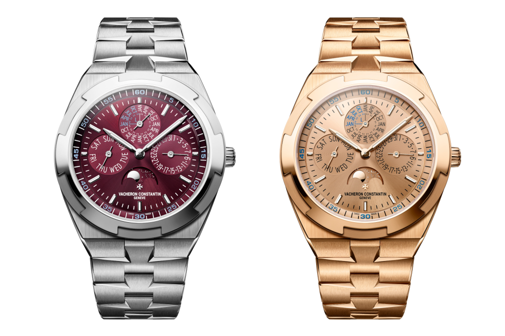Vacheron Constantin встречает новый сезон двумя яркими дополнениями к своей коллекции Overseas — ультратонкими часами Perpetual Calendar из розового золота с соответствующим циферблатом и часами из белого золота с циферблатом, покрытым насыщенным бордовым лаком.