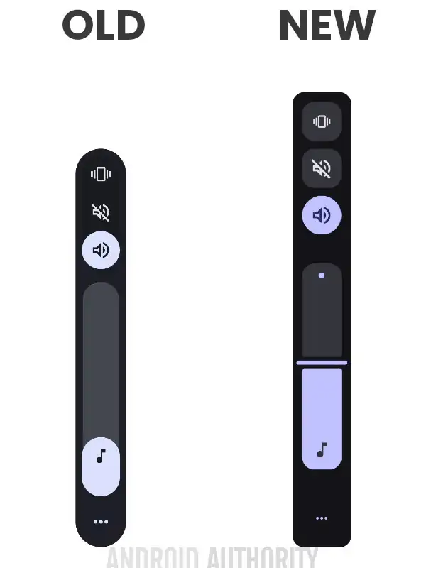 Соответствующий ползунок регулировки громкости также был переработан. Теперь он имеет менее округлую форму с тонкой прямоугольной ручкой, а значок регулировки громкости расположен внизу, а не вверху. Три точки, открывающие панель регулировки громкости, стали меньше, а переключатель режимов отображается в виде закруглённых прямоугольников.