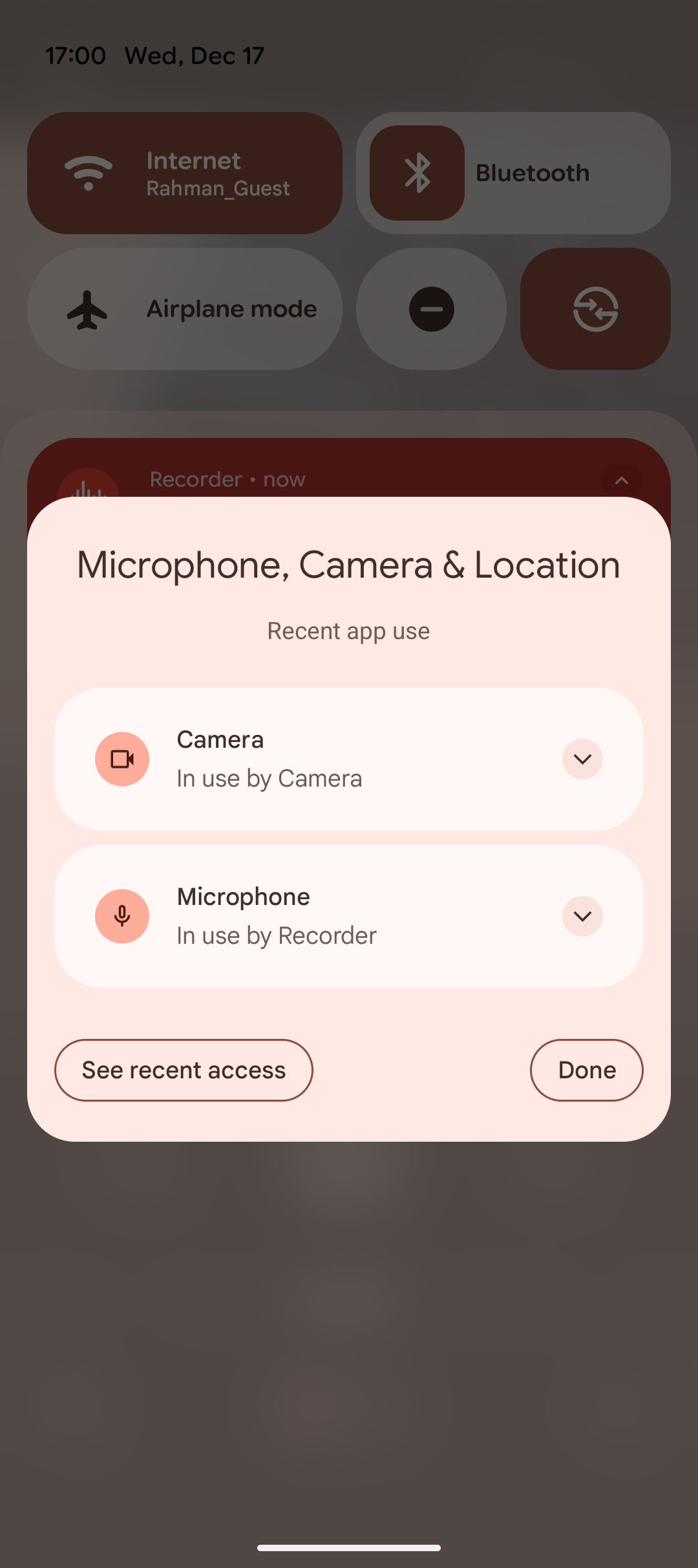 Google внедрила индикаторы конфиденциальности в Android 12. Они предупреждают вас, когда приложения используют камеру или микрофон. Когда индикатор активен, в строке состояния появляется зеленый значок. Если на него нажать, откроется окно конфиденциальности, где точно указано, какие программы используют эти разрешения.